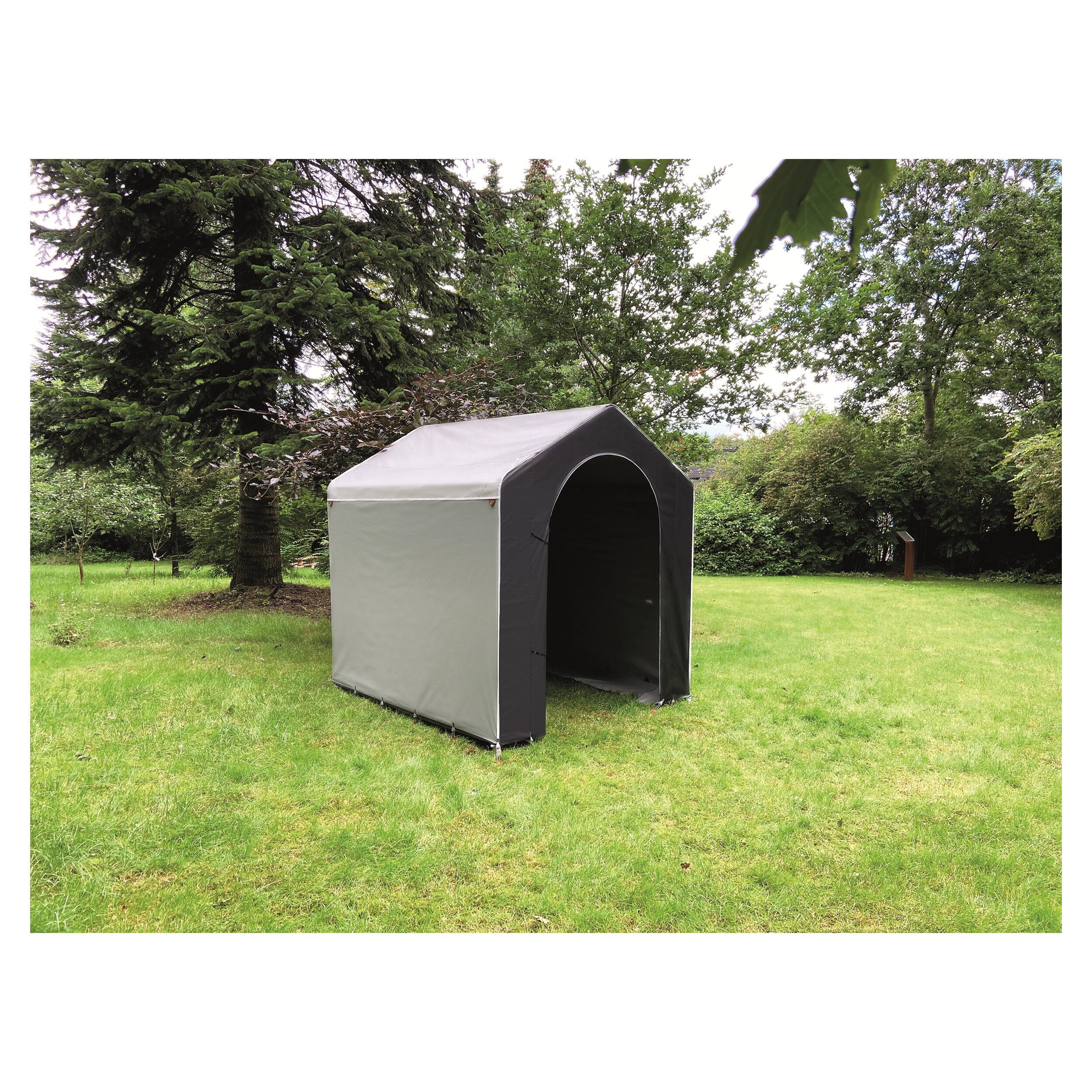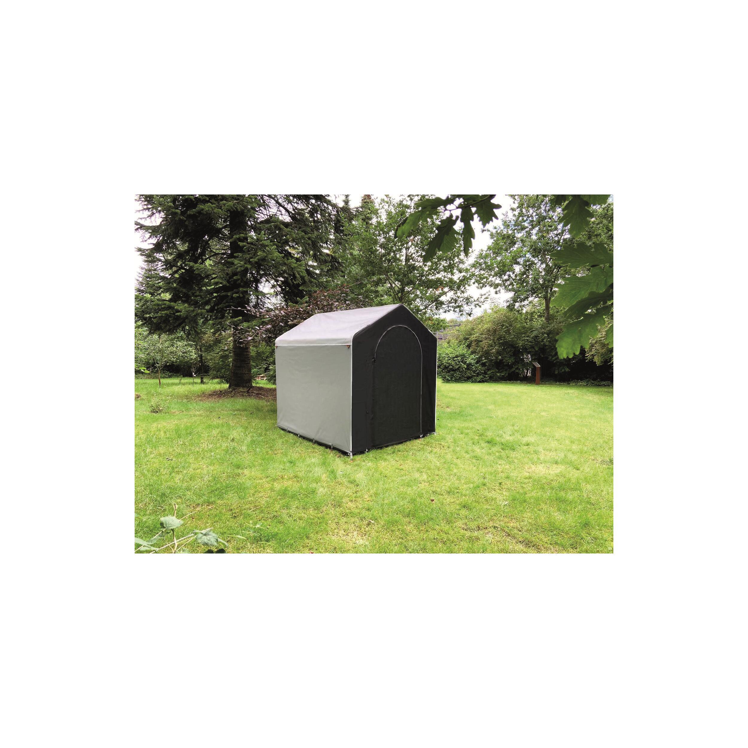 Abri extérieur multifonction spécialement conçu pour les campeurs sédentaires ayant besoin de plus d'espace de rangement et de stockage. Utilisation possible en long séjour grâce à sa toile en PVC et son armature en Acier renforcée.
