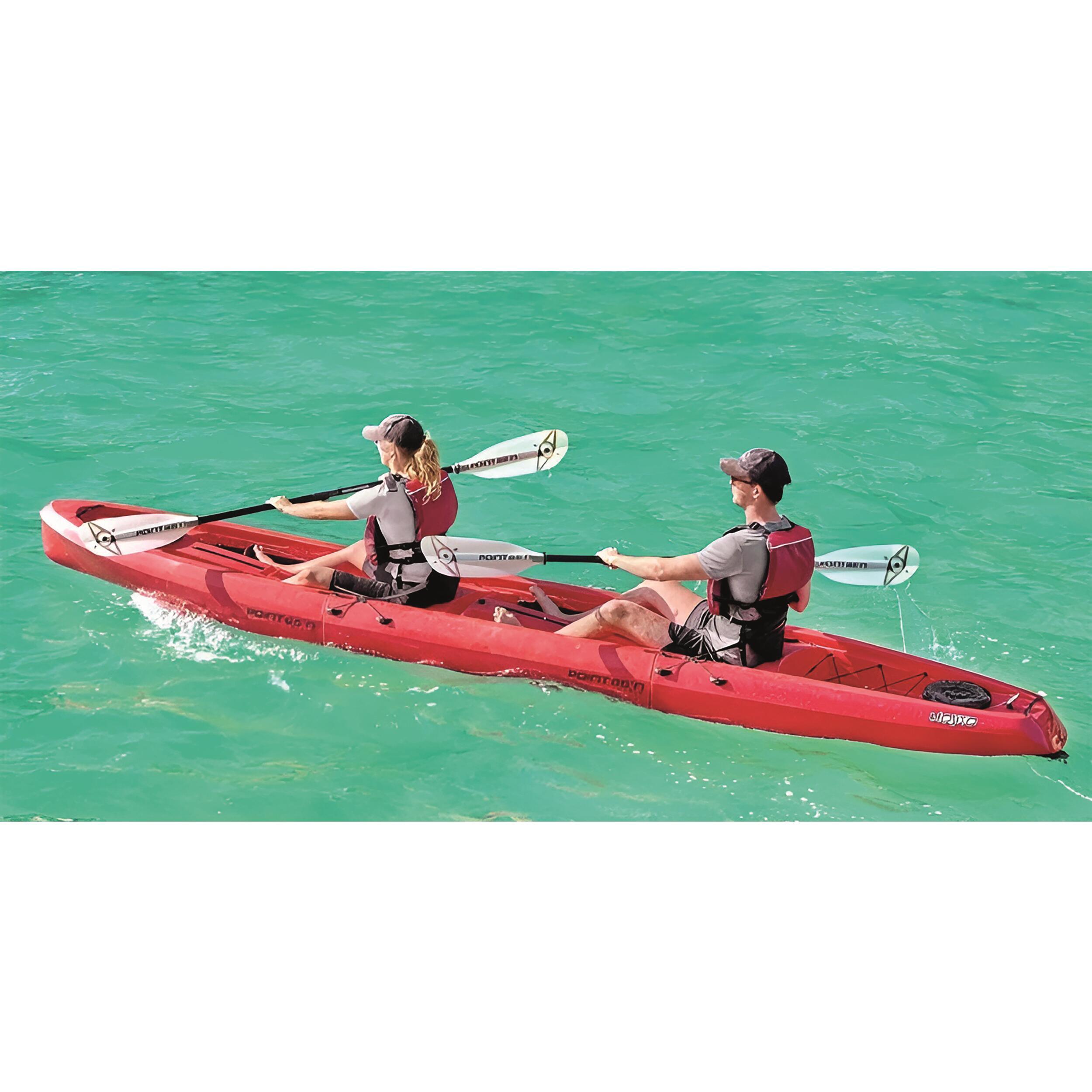 Kayak duo modulable rouge équipé de sièges escamotables et d’un gouvernail à pédales.