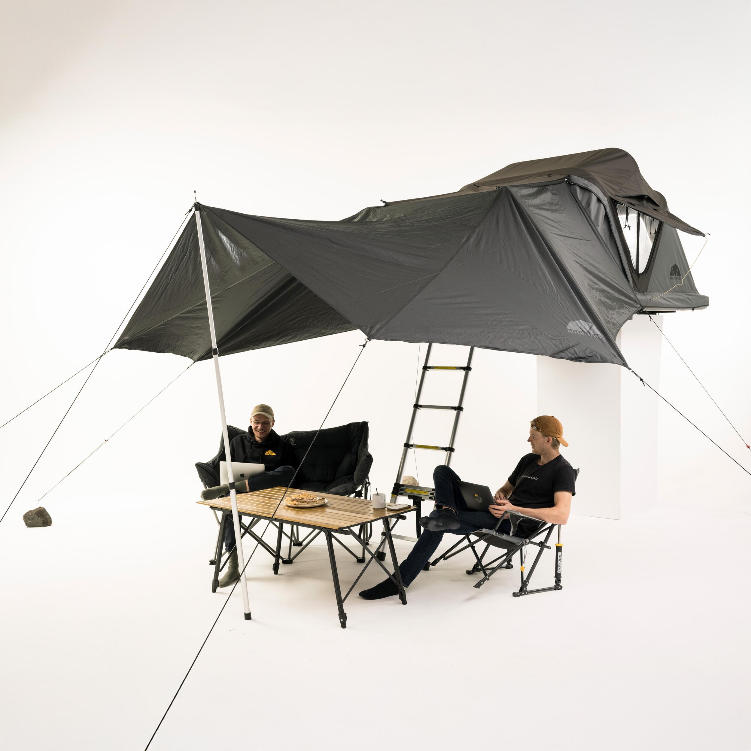 Protégez-vous du soleil avec le store Roof Space 2. Offrant une couverture de 3 x 3,5 m, il est flexible grâce à ses tiges télescopiques réglables et facile à installer sur votre tente de toit. Léger et pratique, il pèse seulement 3,5 kg.