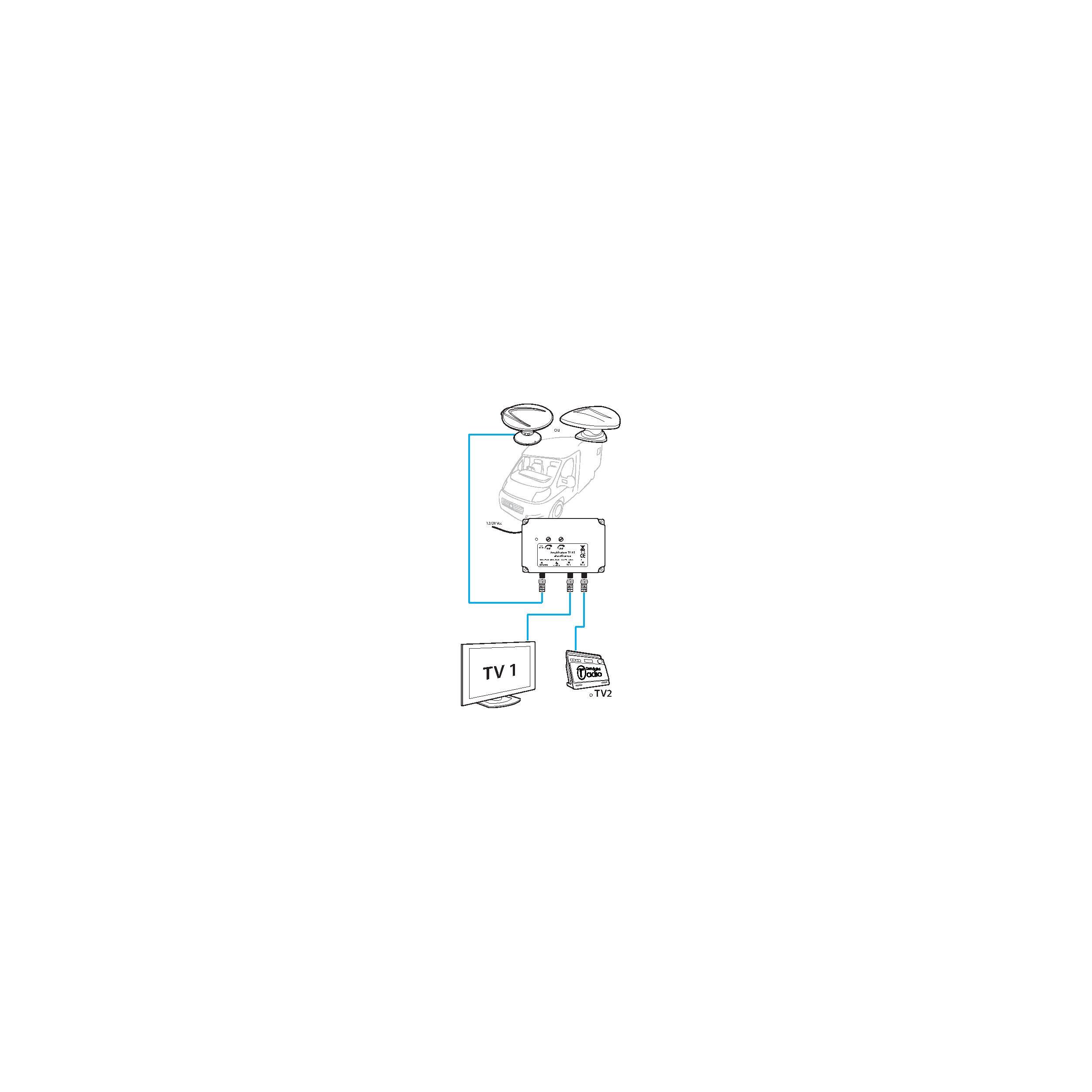 Gain max. : UHF 30 dB / VHF 26 dB. Dim. (H x Diam.) : 16 x 42 cm. Amplificateur 12/24/220 V avec deux sorties (TV + Radio). Avec câble coaxial à faible perte (5 m) et 2 connecteurs F.