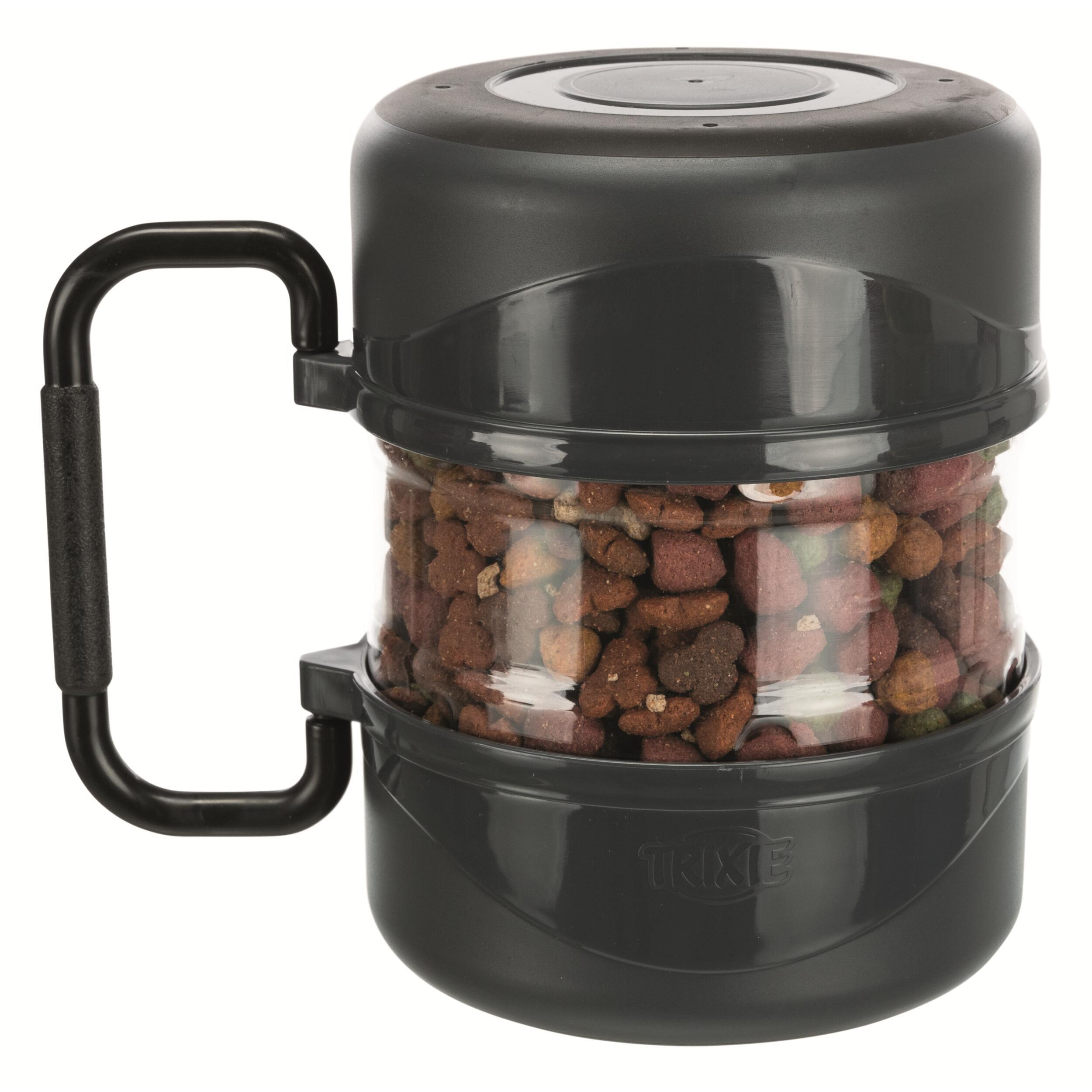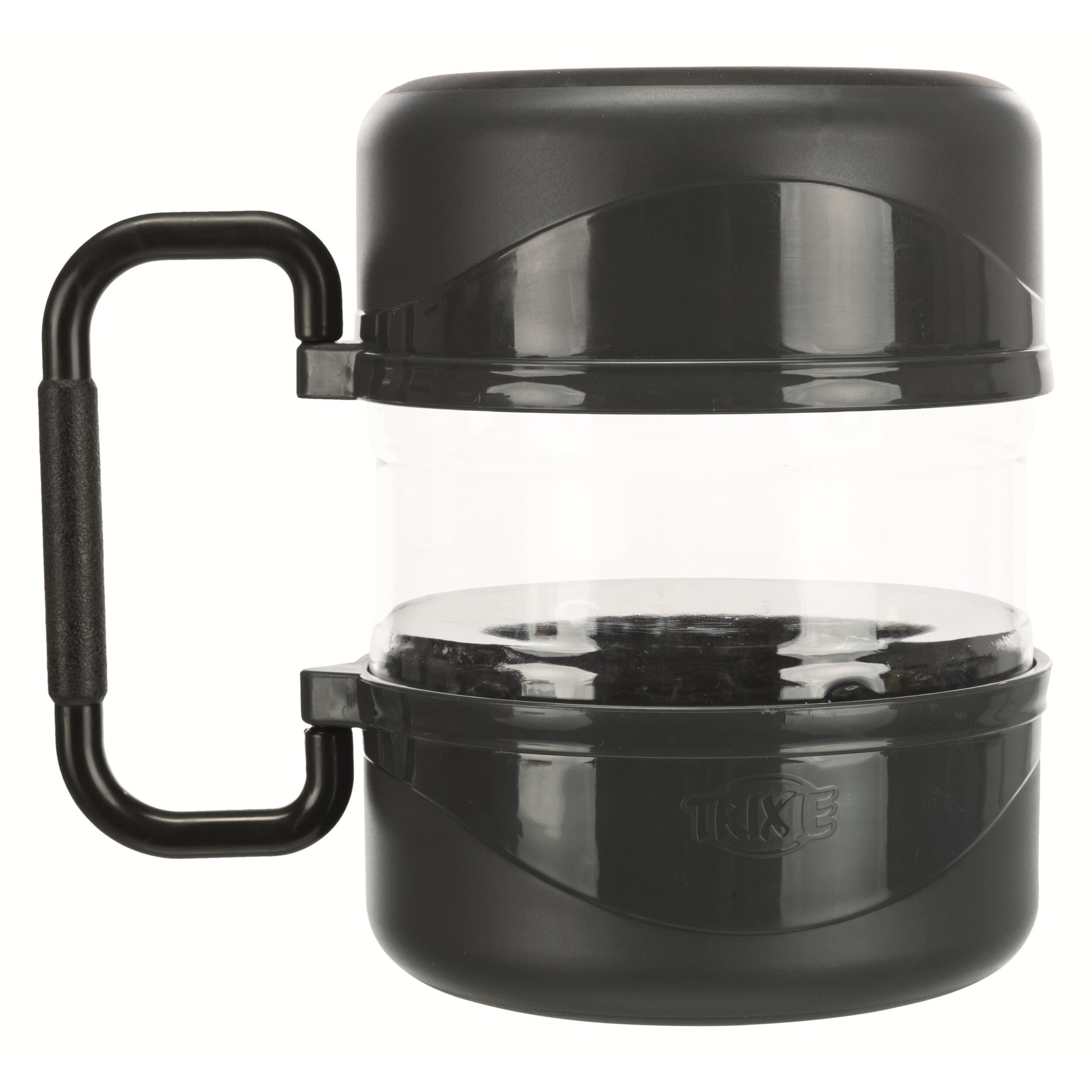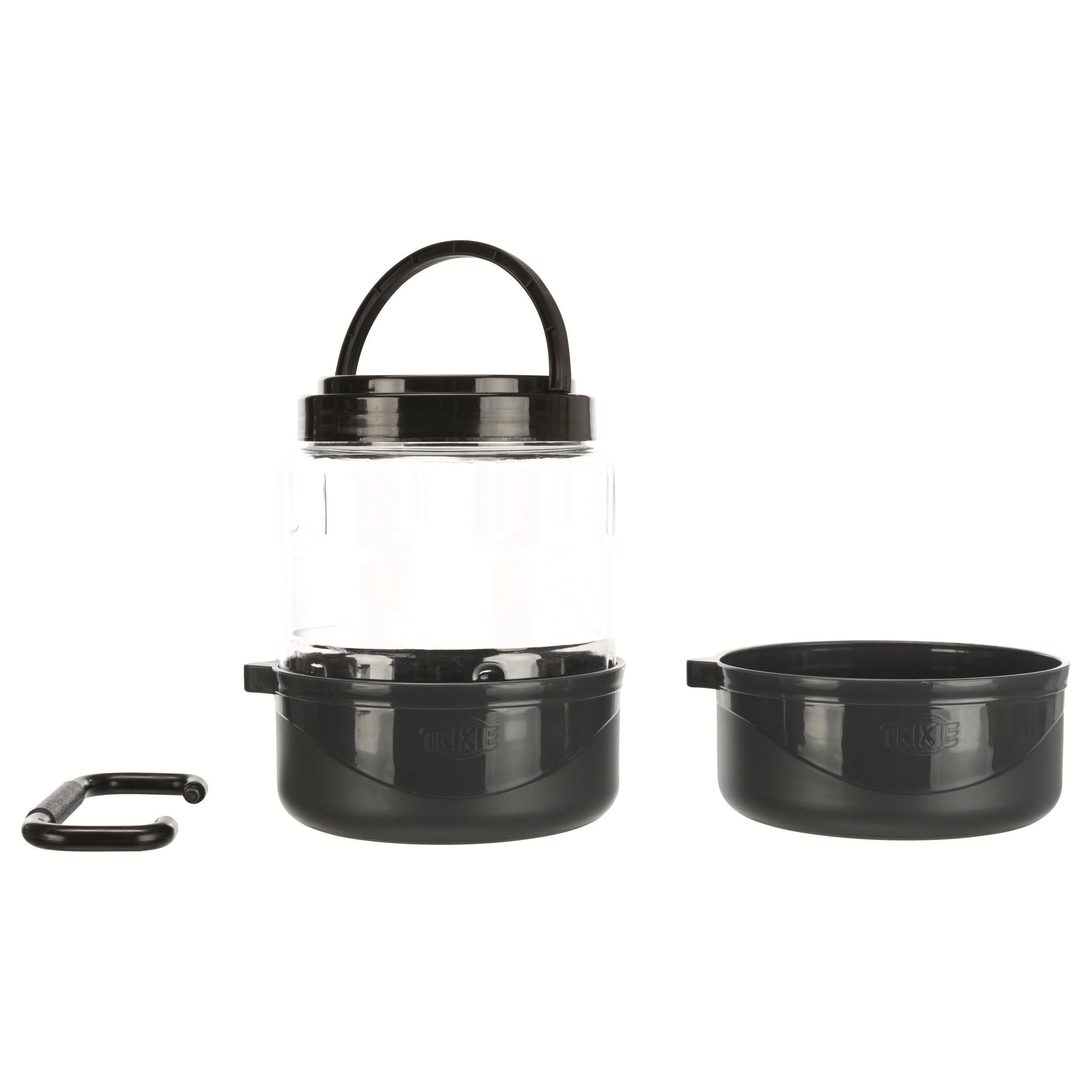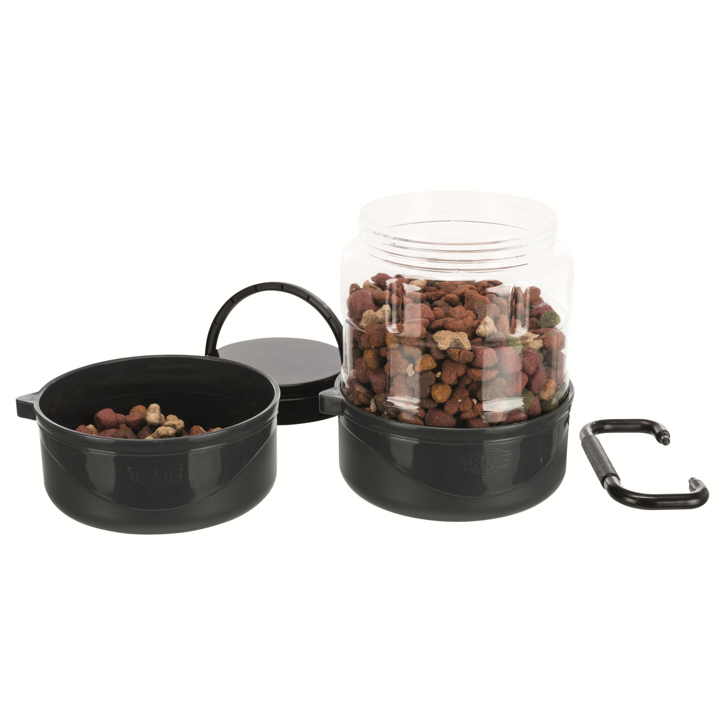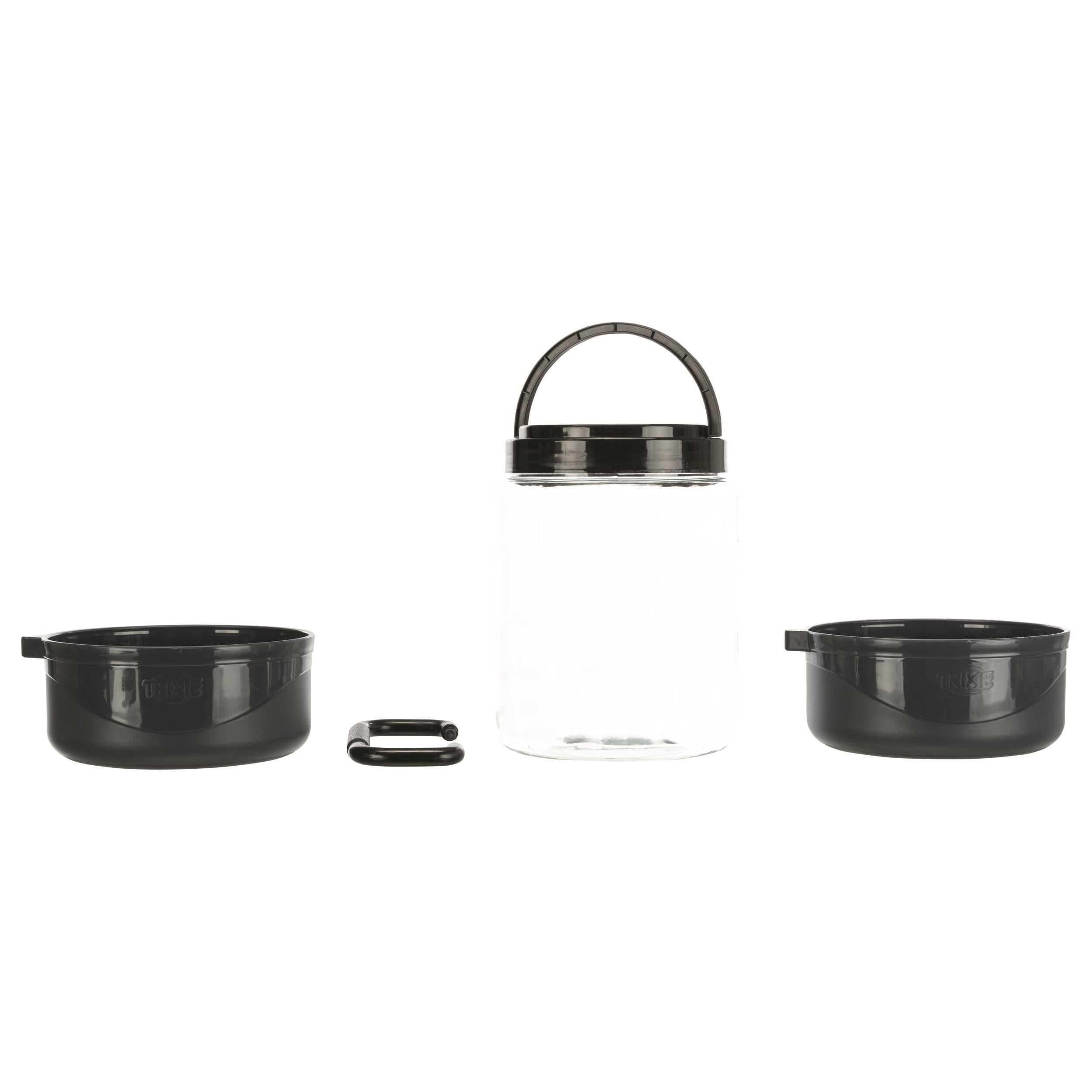 Le set de voyage de Trixie vous simplifie la tache ! Que ce soit pour vos vacances, vos randonnées ou tout simplement votre pique-nique, cet accessoire vous permet d’avoir à portée de main des croquettes et 2 gamelles pour servir non seulement de la nourriture, mais aussi de l’eau à votre animal.