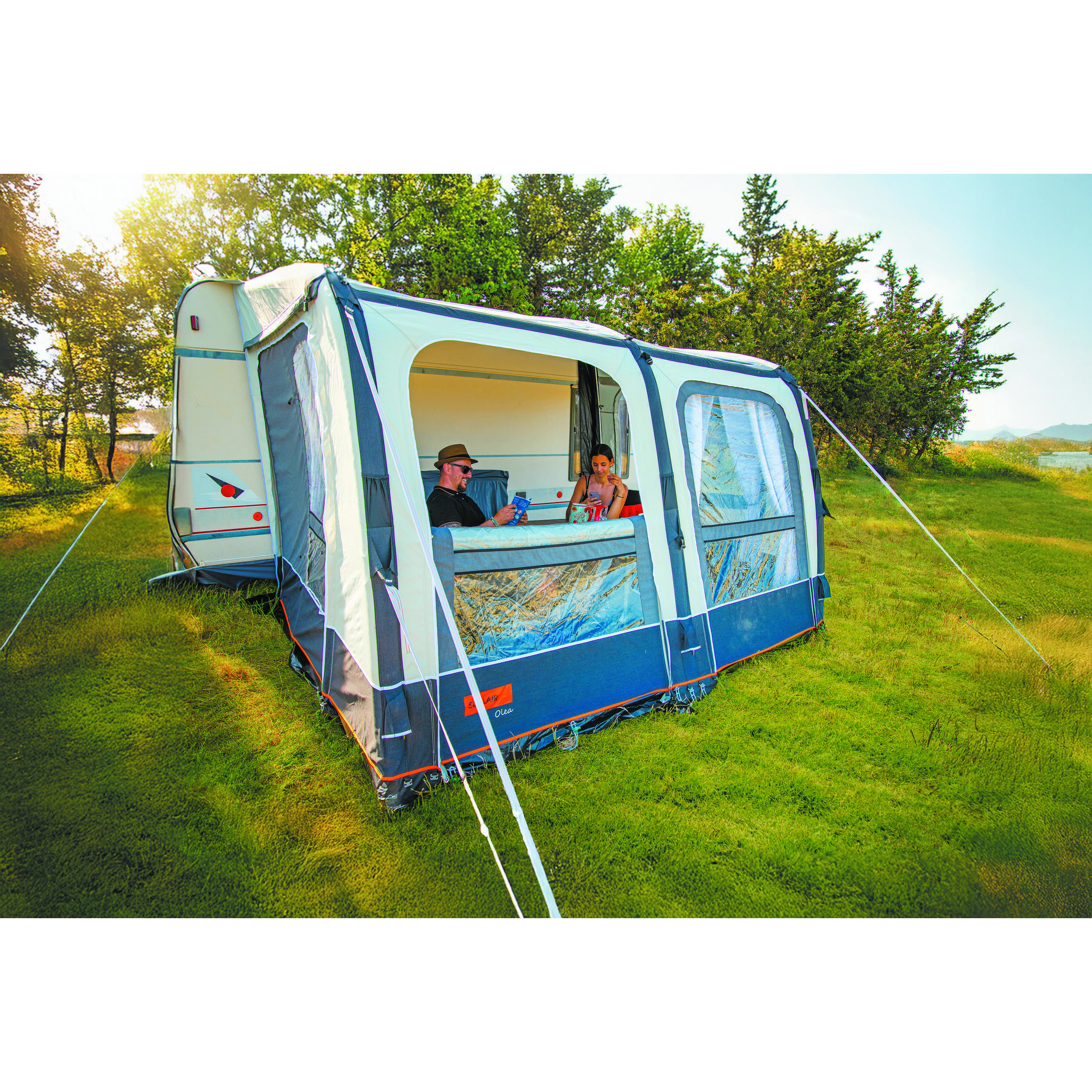 OLEA AIR est livré avec une panoplie d’équipements pour que vous soyez immédiatement prêt à l’usage : rideaux, jupe de bas de caisse, cache-roue, piquets, élastiques, sacs de transport… Tout est là, bien pensé, pour une expérience sans souci. Besoin d’aller plus loin ? Une gamme complète d’options compatibles est disponible : chambre annexe, pompe électrique, kits d’éclairage, tapis de sol ou encore barres balcon. L’auvent s’adapte à vos envies et à vos habitudes de voyage.