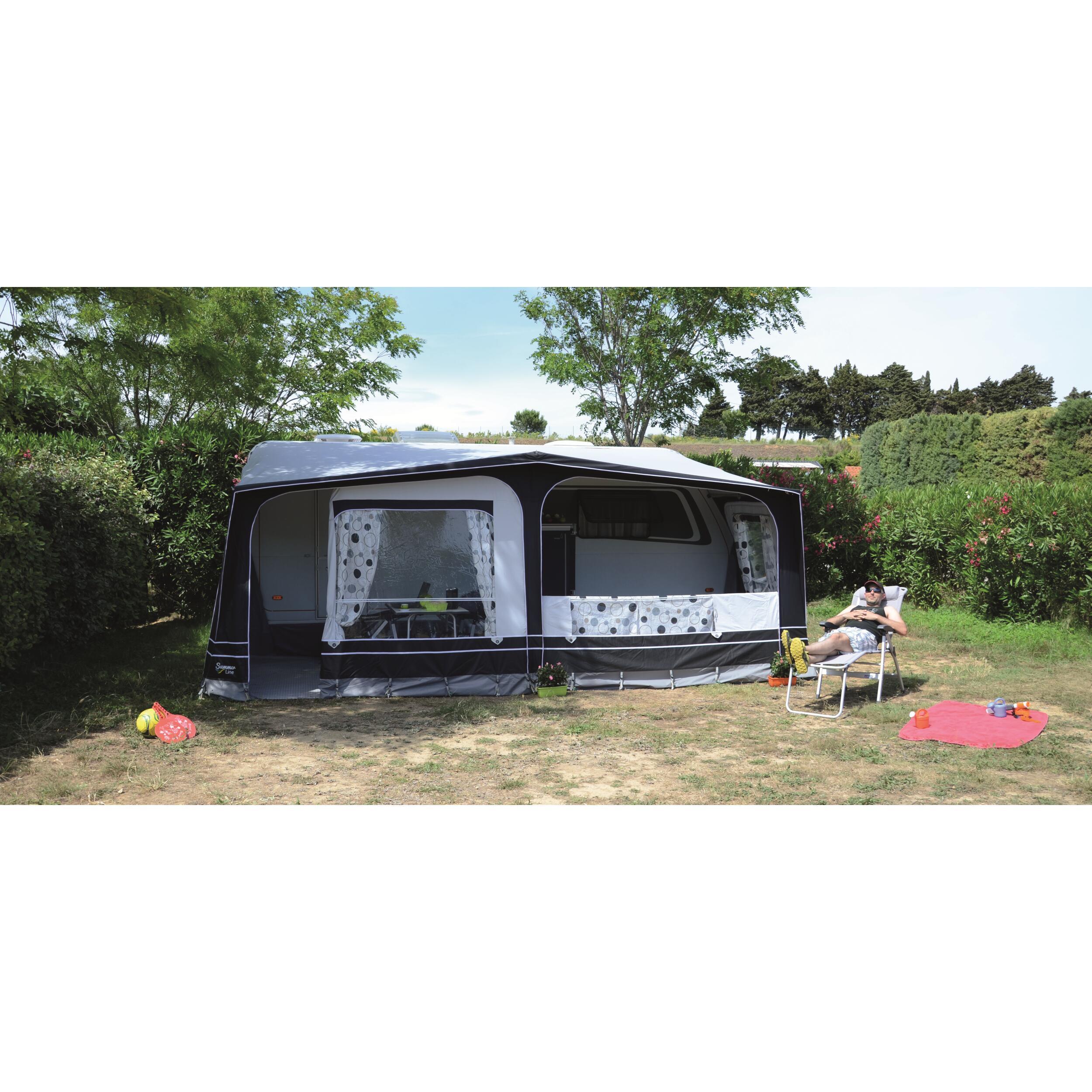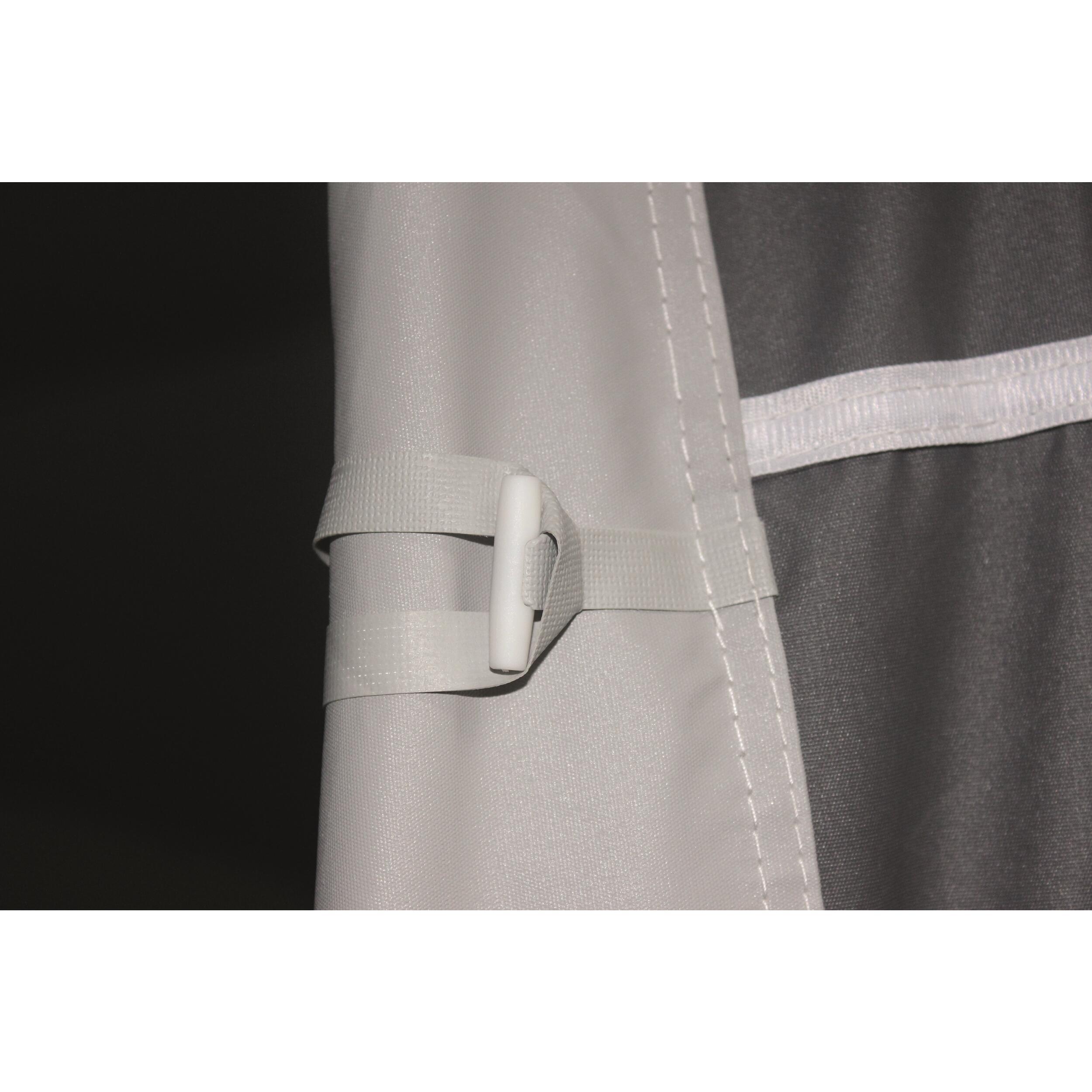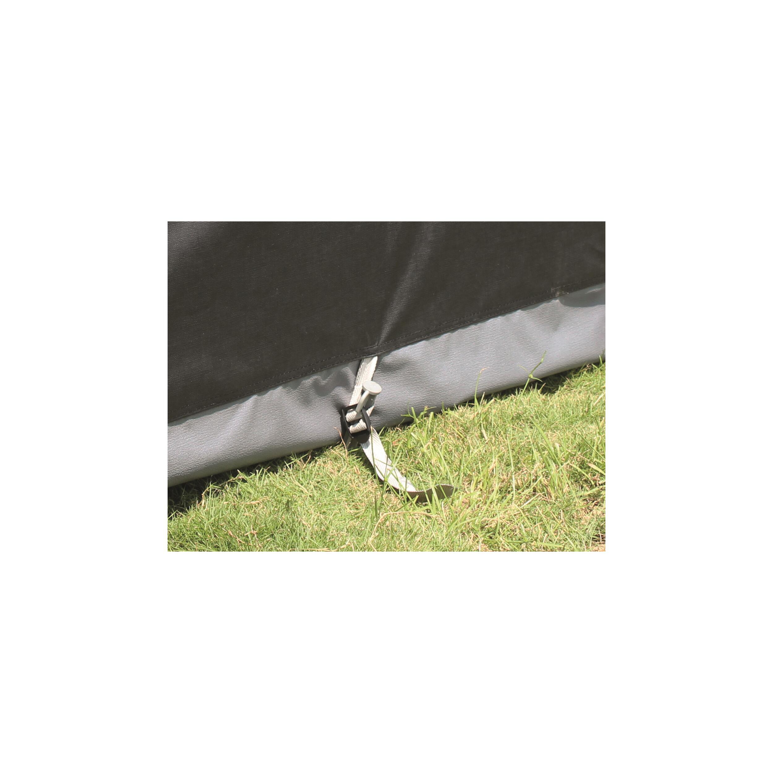 Divers : Fermeture à glissières double curseur. Jupe de bas de caisse et cache roue fournis de série. Accessoires de fixation au sol (tendeurs, piquets, sardines) inclus. Sacs de rangements individuels pour la toile, l'armature et les accessoires.