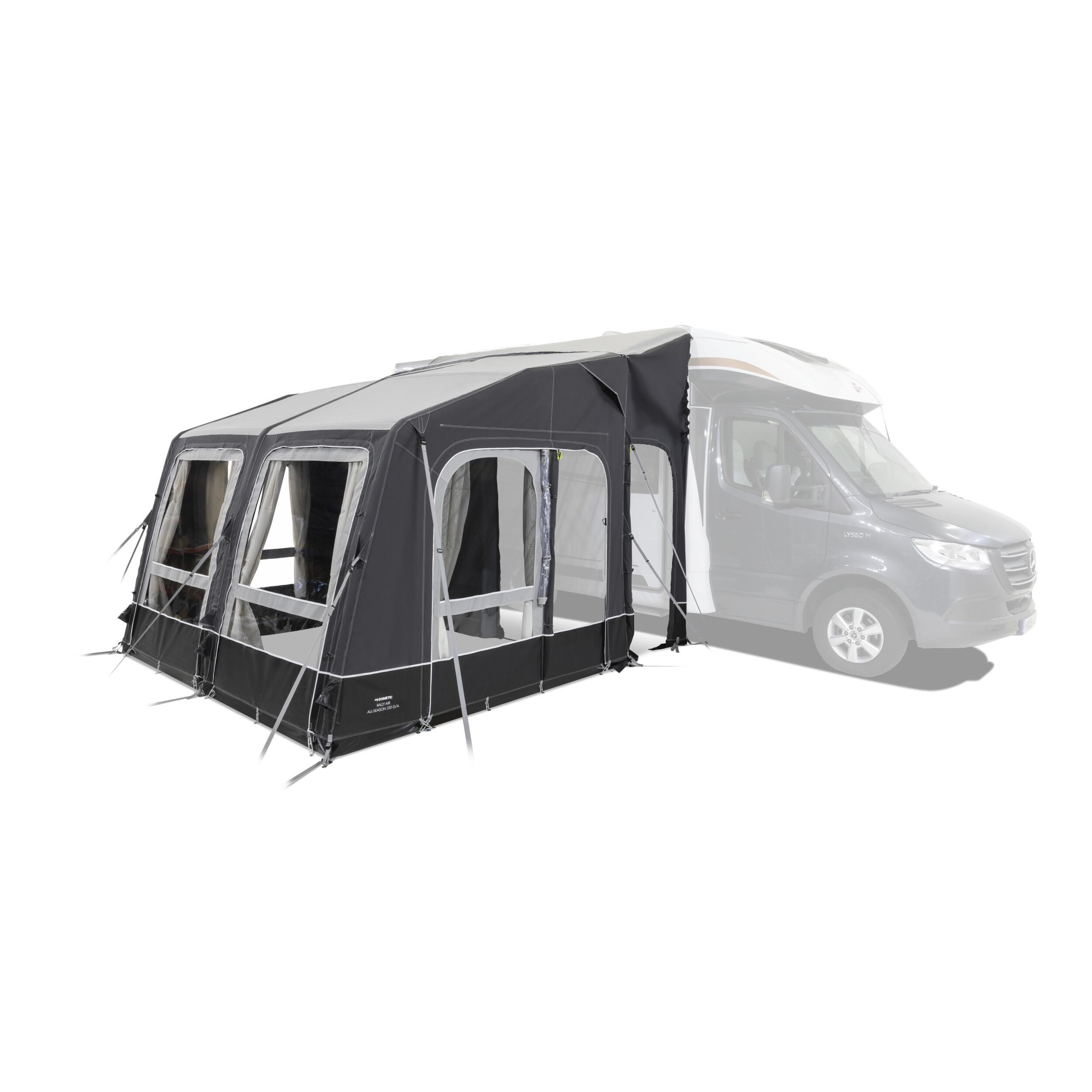 Le Dometic Rally AIR All-Season 330 DA est un auvent indépendant gonflable, robuste et polyvalent, avec gonflage à un seul point et panneaux amovibles pour une utilisation en mode solette.