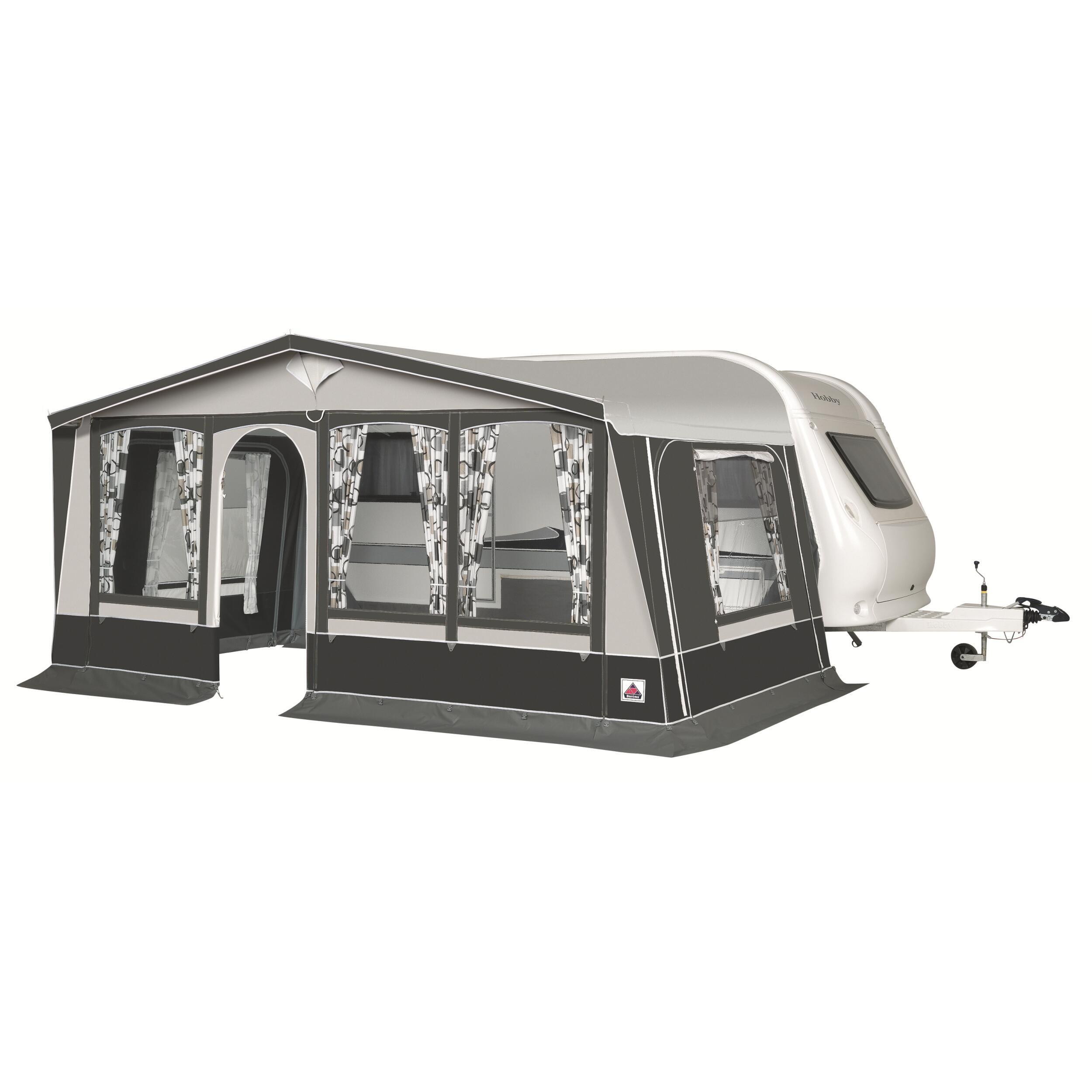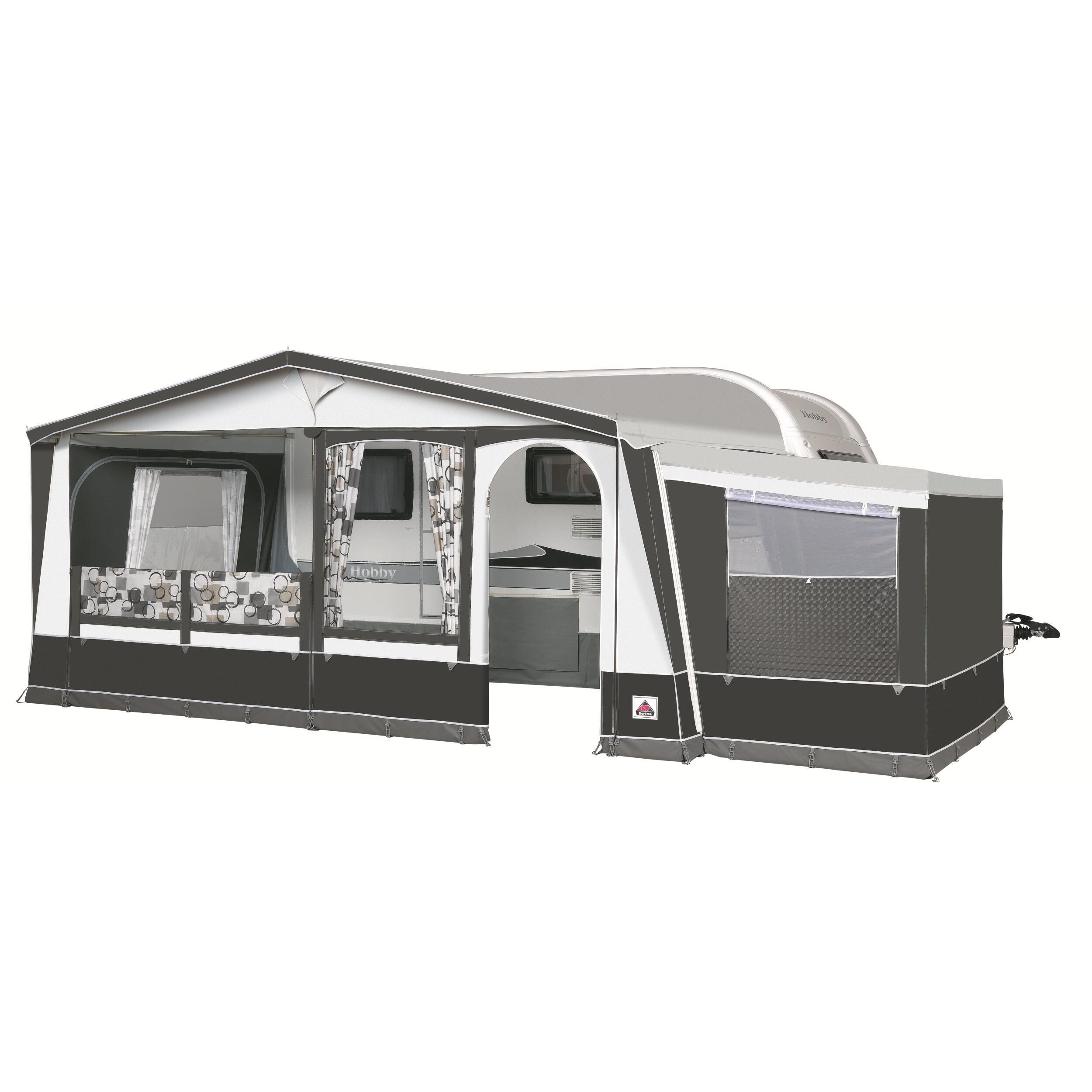 Toit : Polyester enduit PVC double face, lavable 520 gr/m2. Façade et murs : Polyester enduit PVC double face, lavable, 380 gr/m2.