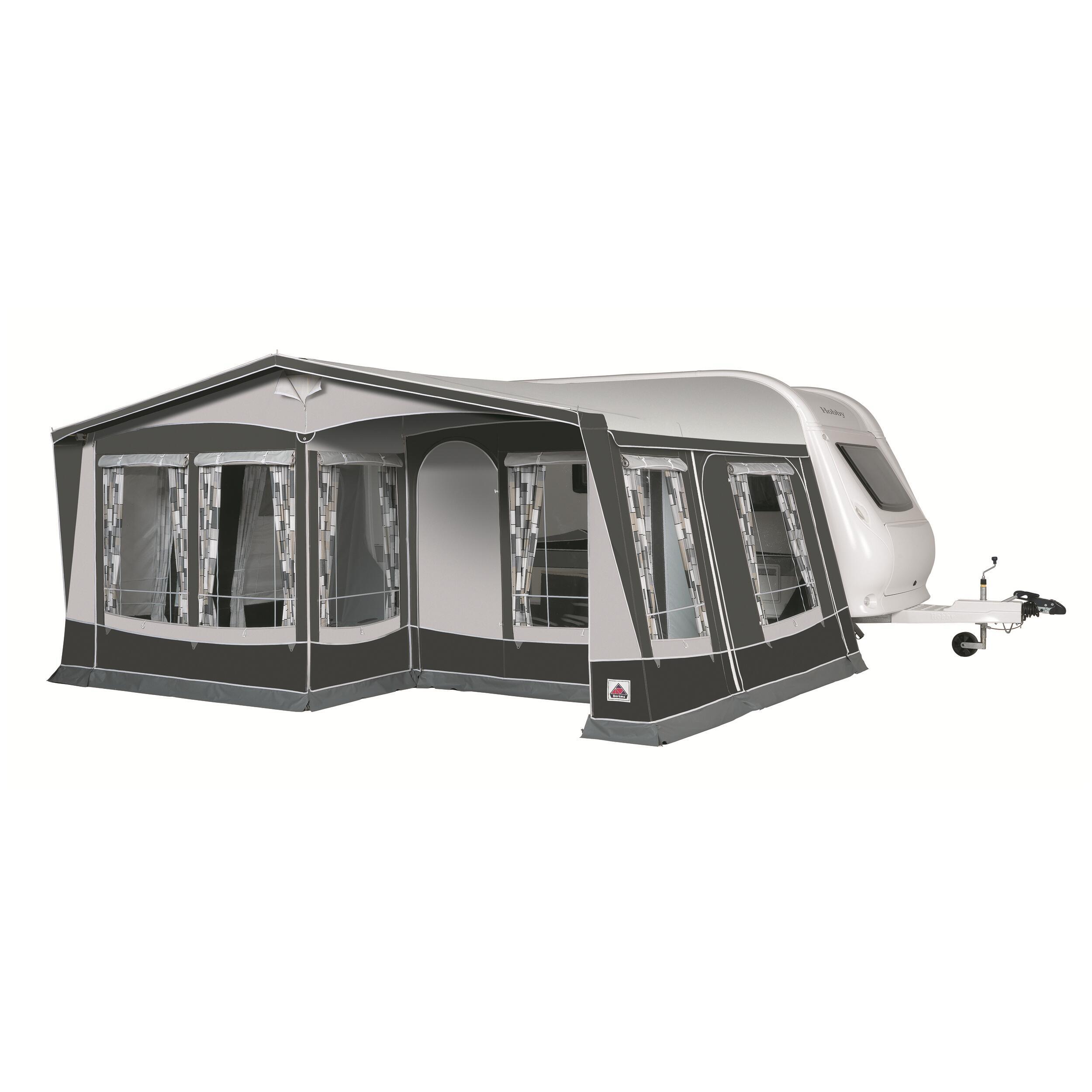 Sectionnement flexible de la façade. Le patio couvert peut être créé en déplaçant vers l'intérieur un seul ou les 2 panneaux de façade (mur perpendiculaire de séparation à prévoir en option). Aération par moustiquaire réglable par fermeture à glissières.