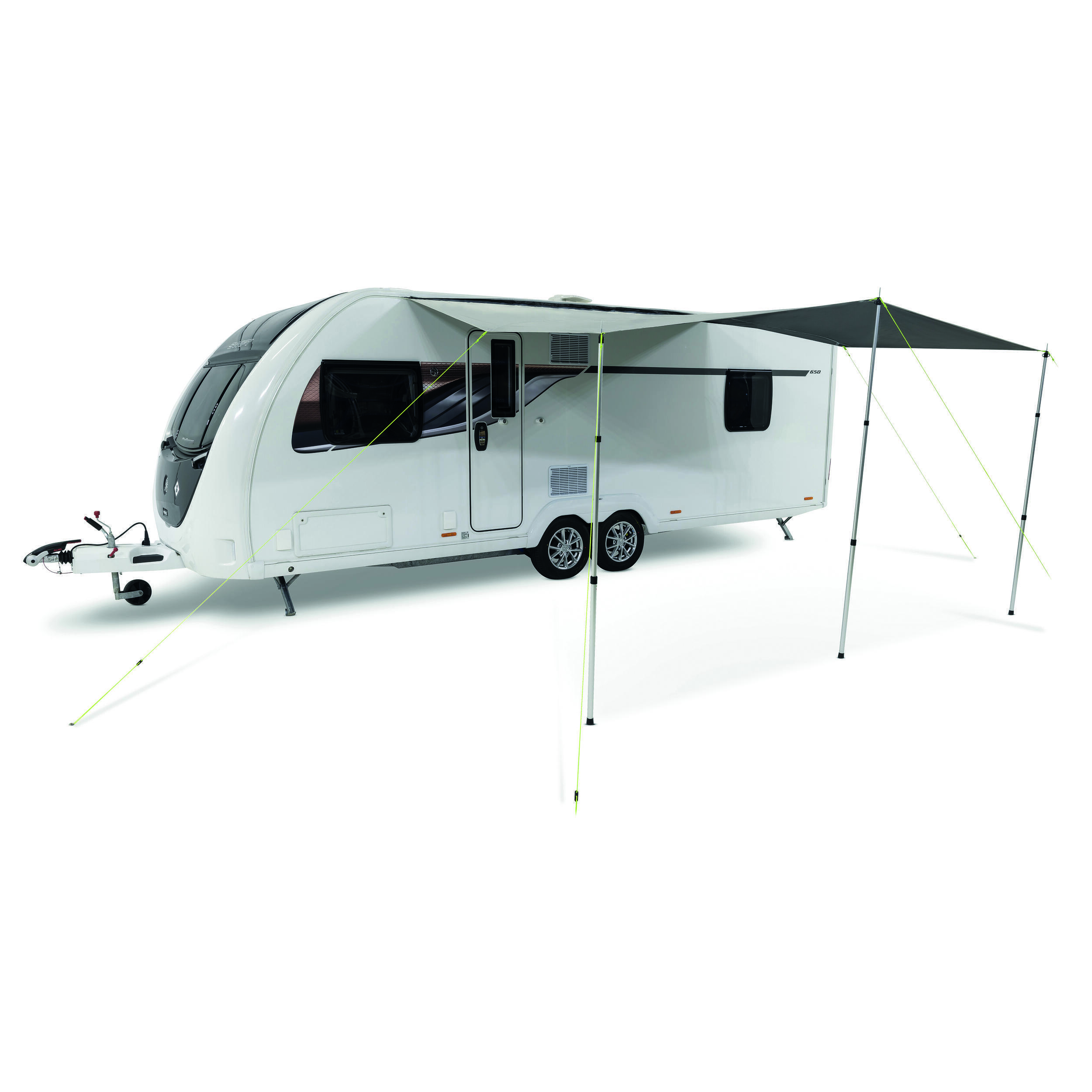 Utilisée seule, la solette se glisse dans le rail de la caravane. Elle permet de se protéger du soleil ou de la pluie lors des haltes.