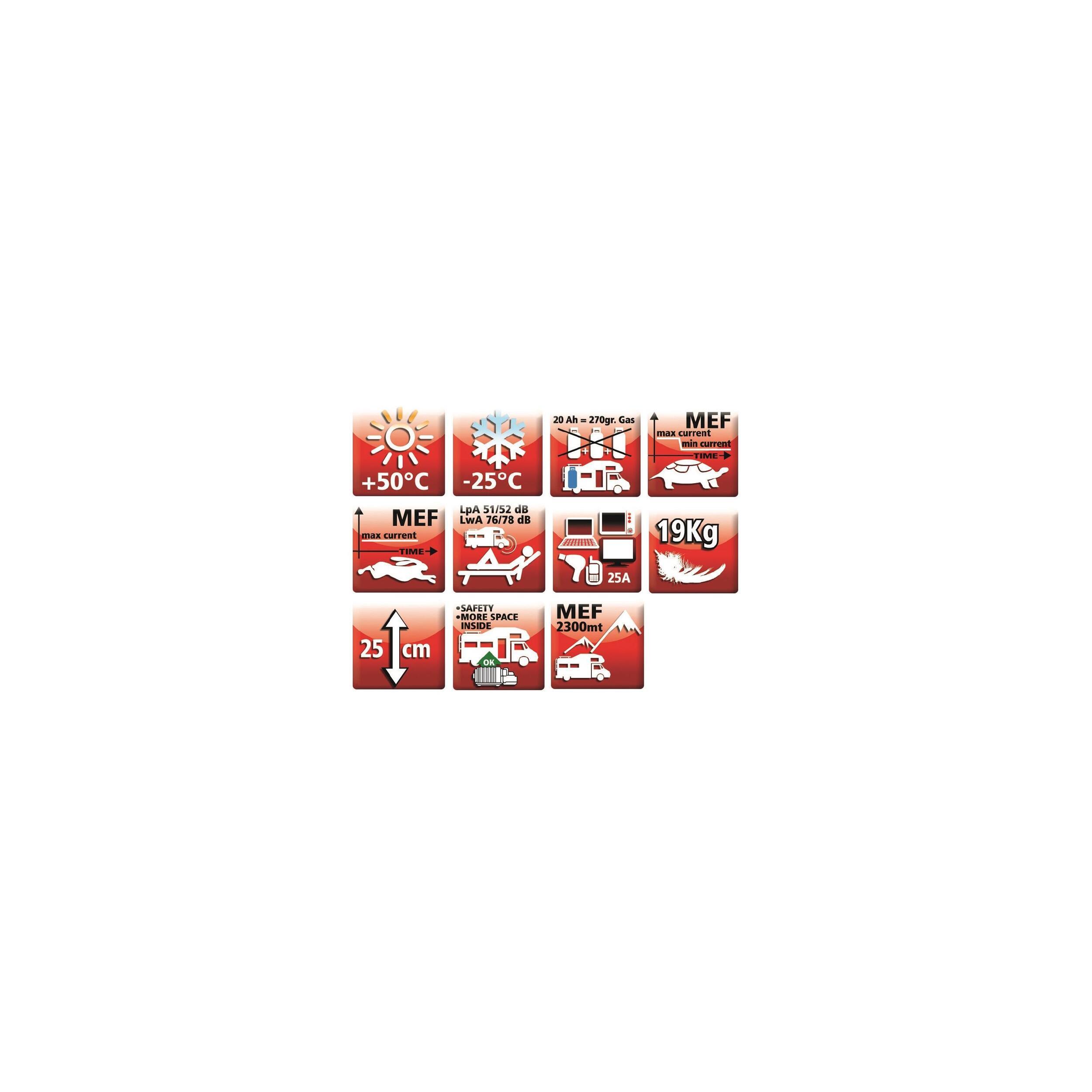 Chargeur de batteries 12 Volts fonctionnant au gaz et GPL. Démarrage et arrêt automatiques en fonction de la tension de la batterie. Tableau de commande déporté. Arrêt automatique dès que le moteur est en route. Installation discrète sous le châssis grâce à son format compact.