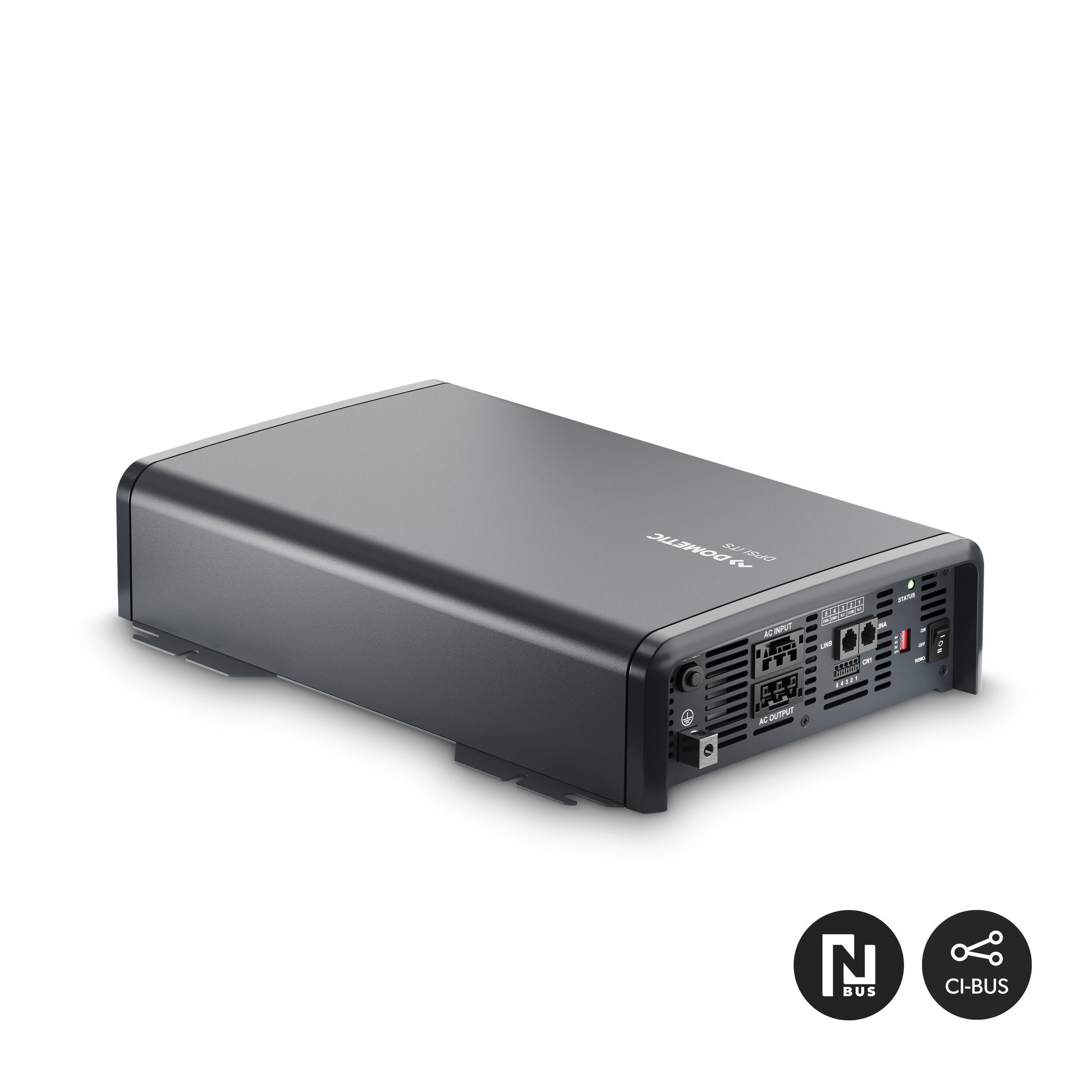 Le pilotage peut se faire via un écran mural, une application ou une télécommande. Le convertisseur est compatible N-BUS et CI-BUS. La consommation est consultable en temps réel via un écran Dometic TD283 ou l’application Dometic Power.
