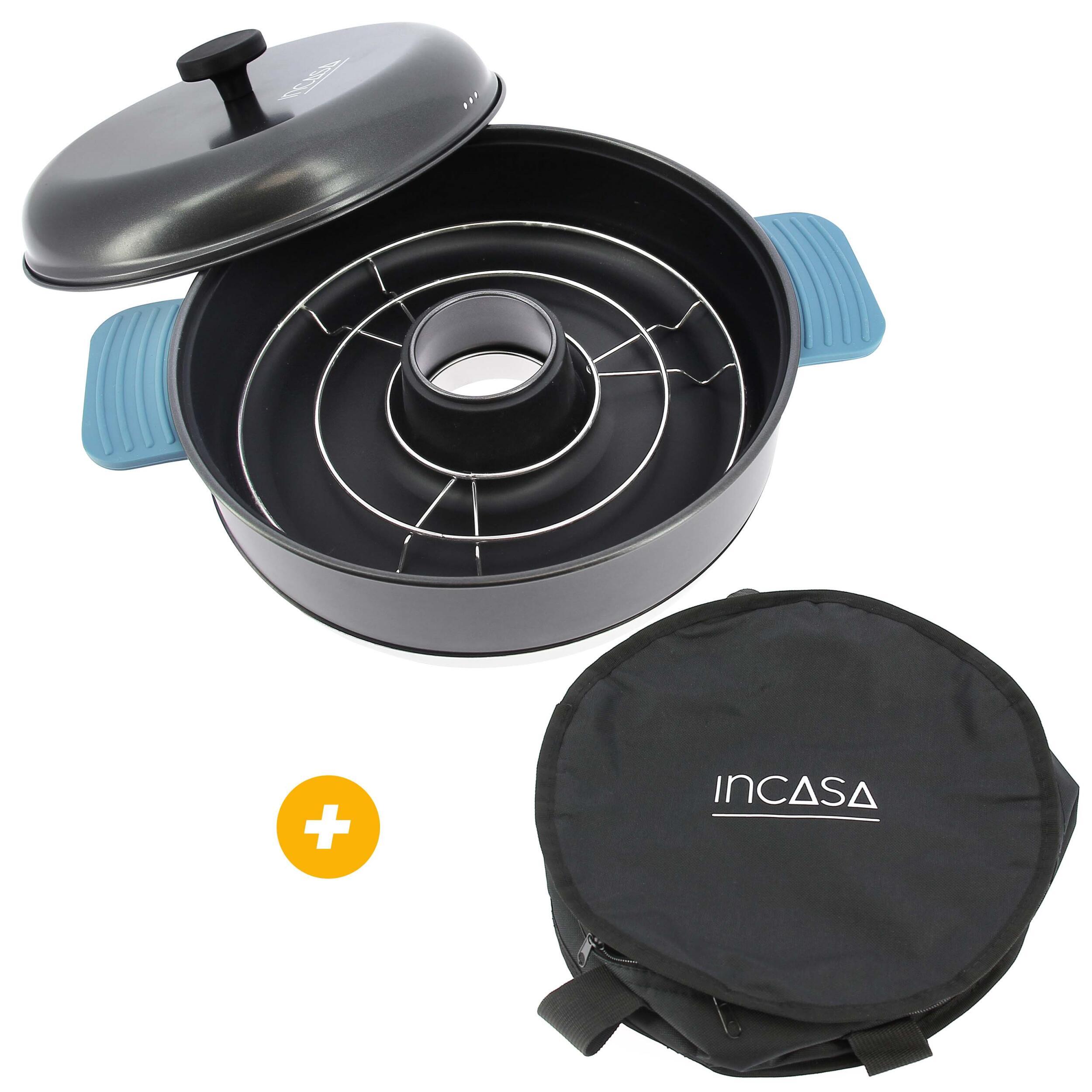 Le secret du four TANDOOR réside dans sa structure ingénieuse composée de plusieurs éléments complémentaires : un moule circulaire avec cheminée centrale, un couvercle bombé, une grille de surélévation et une base renforcée. Cette combinaison permet une circulation de la chaleur à 360°, pour une cuisson uniforme par convection naturelle. Aucun branchement électrique n’est nécessaire : il suffit de le poser sur la flamme de votre réchaud. Grâce à ses poignées latérales isolantes, il est facile à manipuler en toute sécurité. Que vous cuisiniez un clafoutis ou un gratin dauphinois, le résultat est toujours savoureux et bien doré.