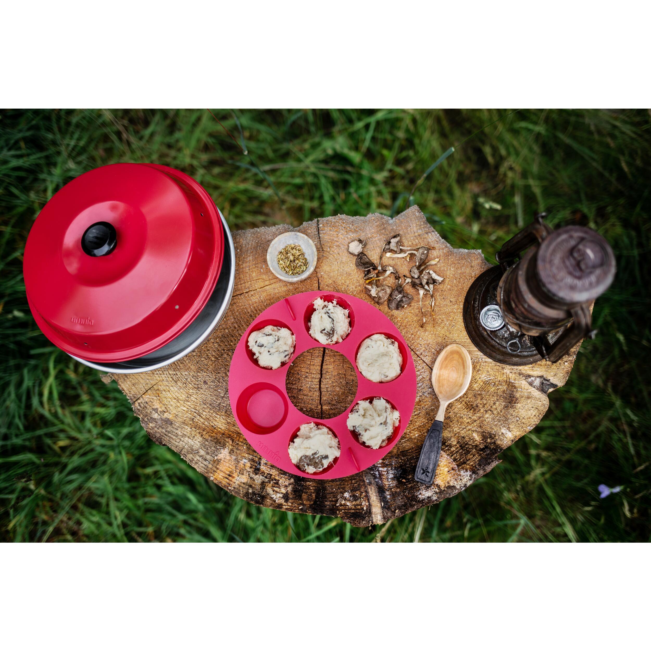 En cas de température trop élevée, la plaque à muffins sera endommagée. Ne jamais mettre en contact direct avec une flamme, ne jamais poser à même la cuisinière. Suivez les instructions du four Omnia en ce qui concerne la manipulation.