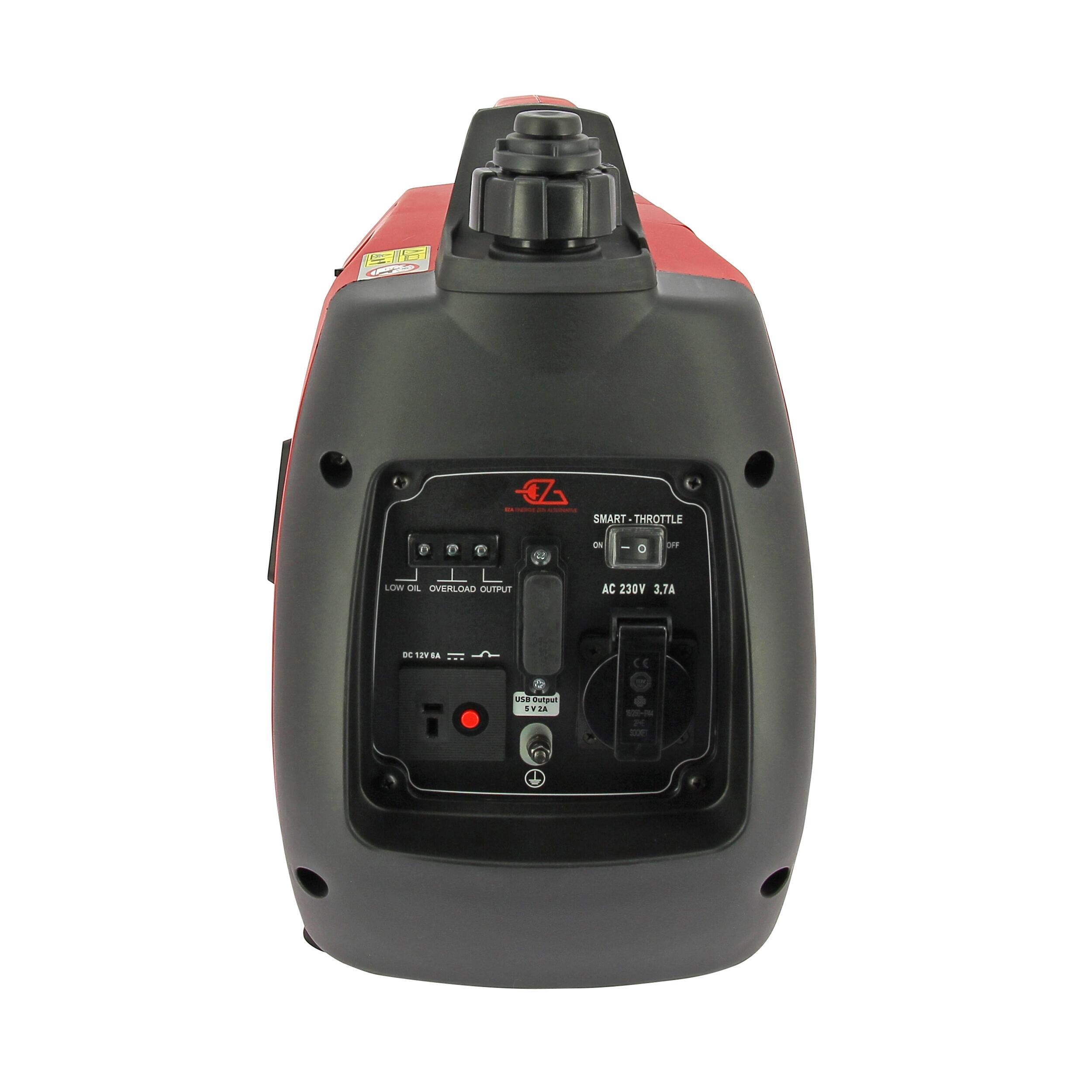 Groupe électrogène portable Eza avec technologie Inverter 50Hz, courant 220V sinusoïdal, mode économique, démarrage par pompe d’amorçage et ports USB intégrés.