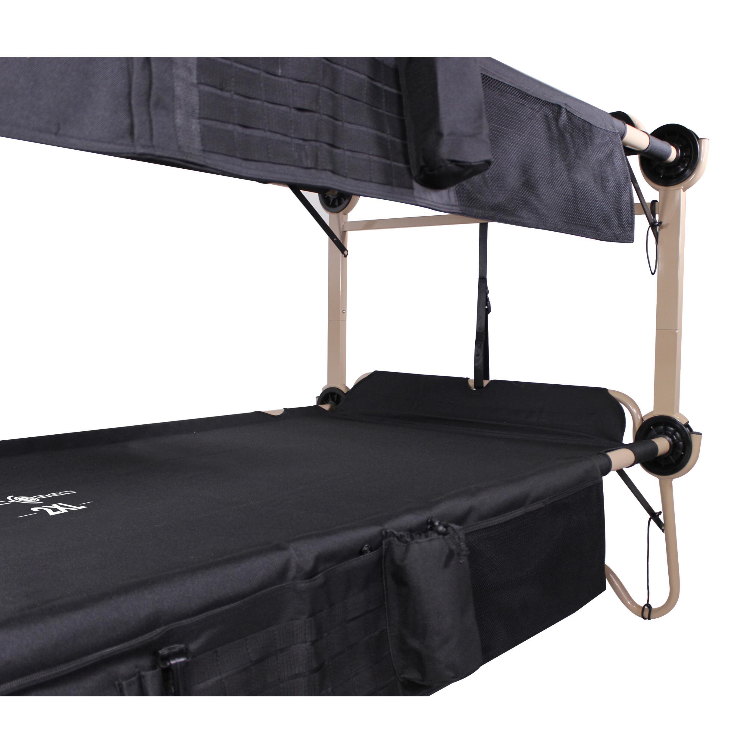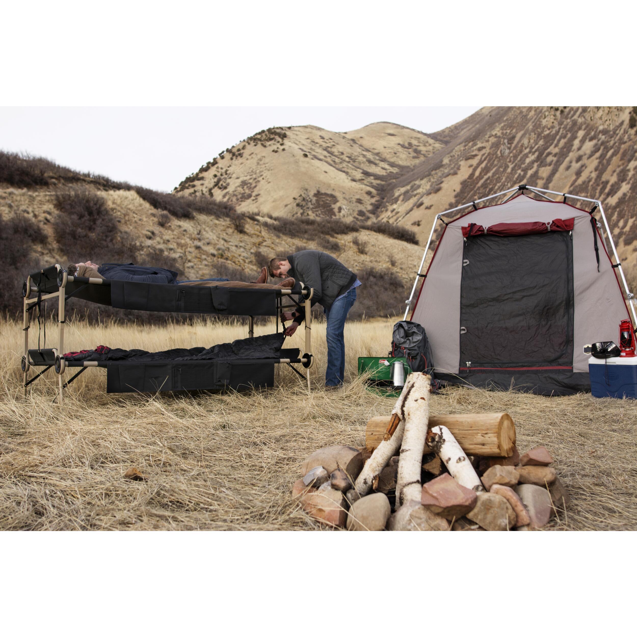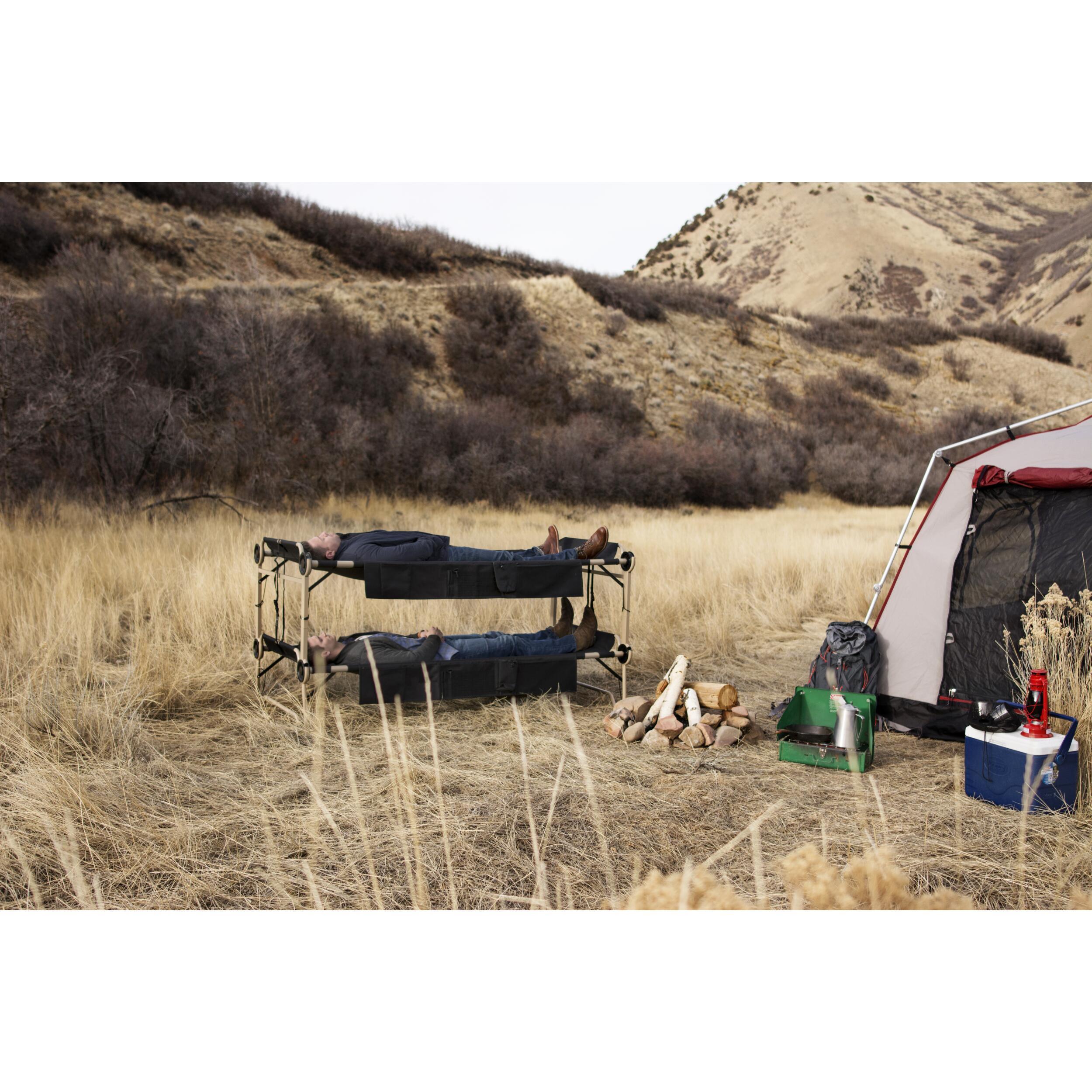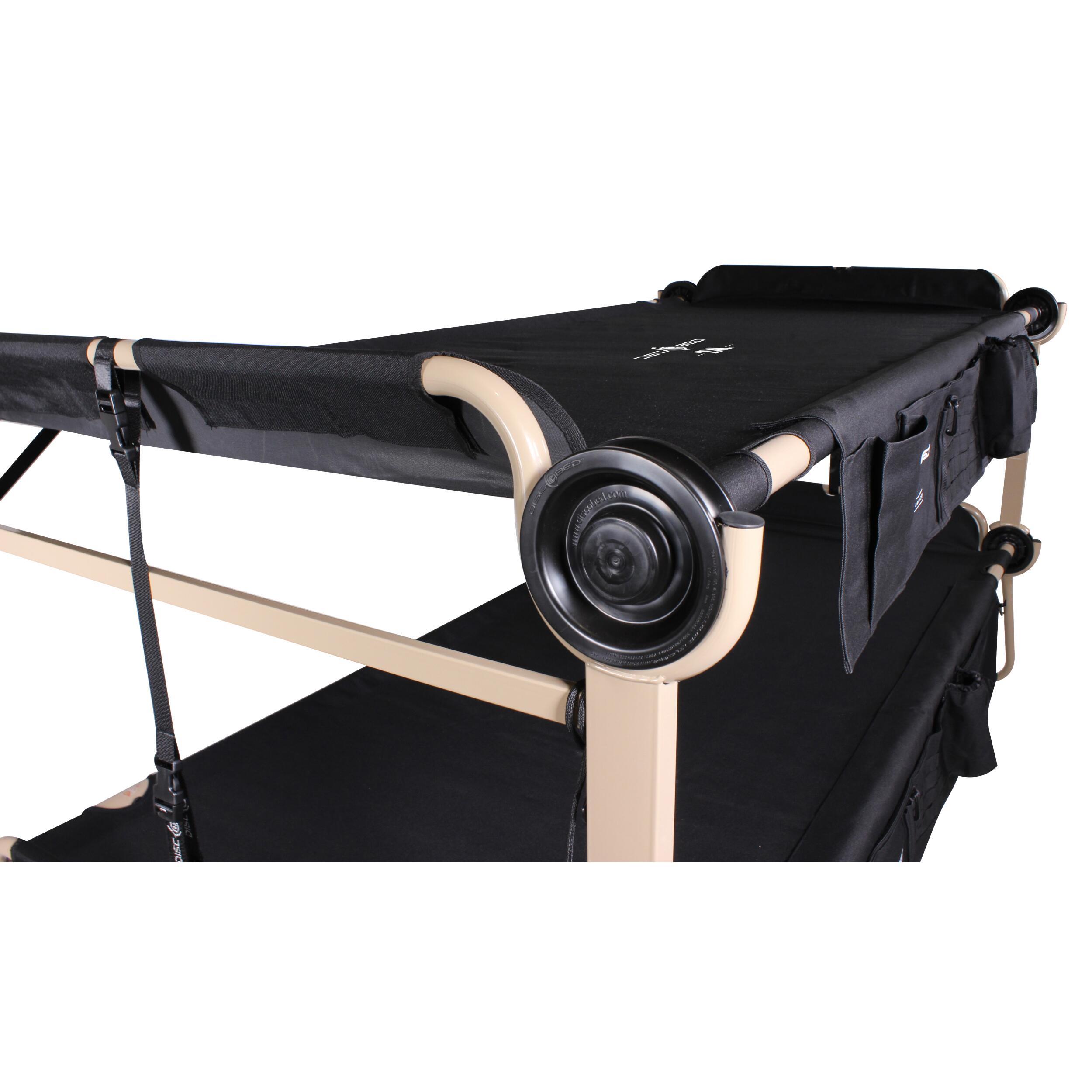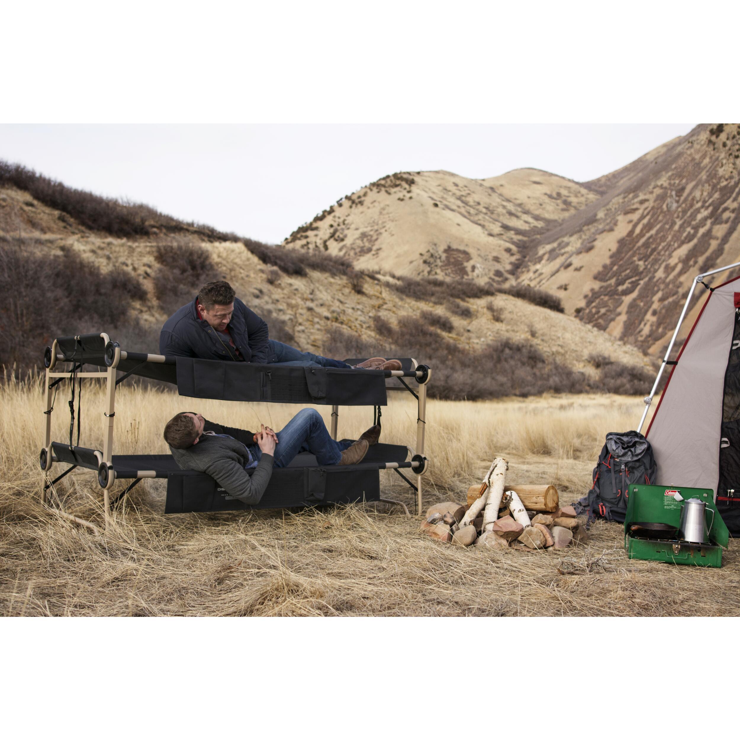 Les lits superposés Disc-O-Bed sont conçus pour offrir un confort optimal en camping. Le cadre arrondi du lit inférieur protège le sol de la tente tout en assurant une stabilité maximale. Avec un tissu en polyester 1200D résistant et un revêtement en PVC, ils garantissent un sommeil réparateur, même sur des terrains irréguliers.