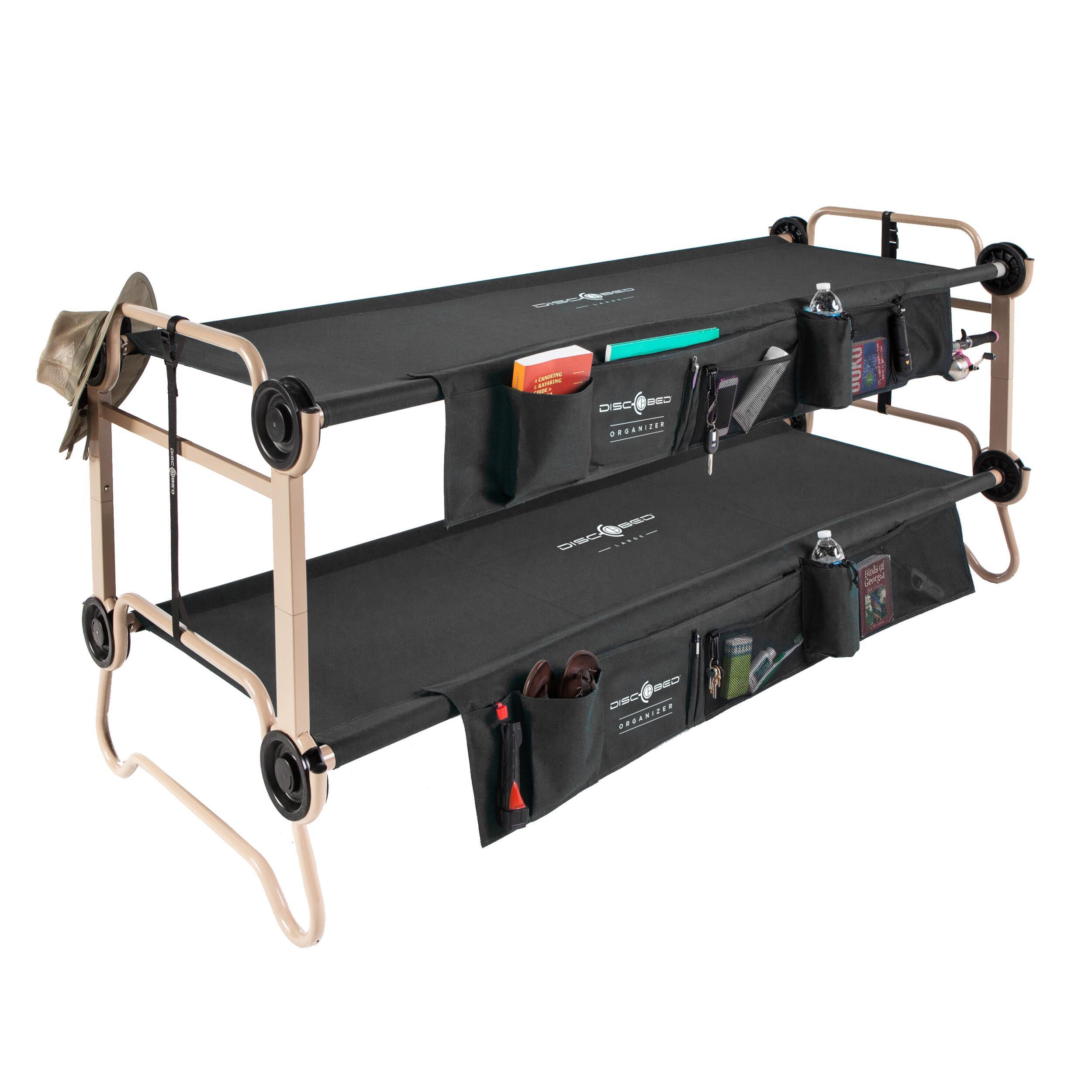 Optimisez votre séjour en camping avec l'organisateur latéral pour lit Disc-O-Bed, offrant de multiples poches pour ranger livres, jouets, bouteilles d'eau et autres objets essentiels des enfants.