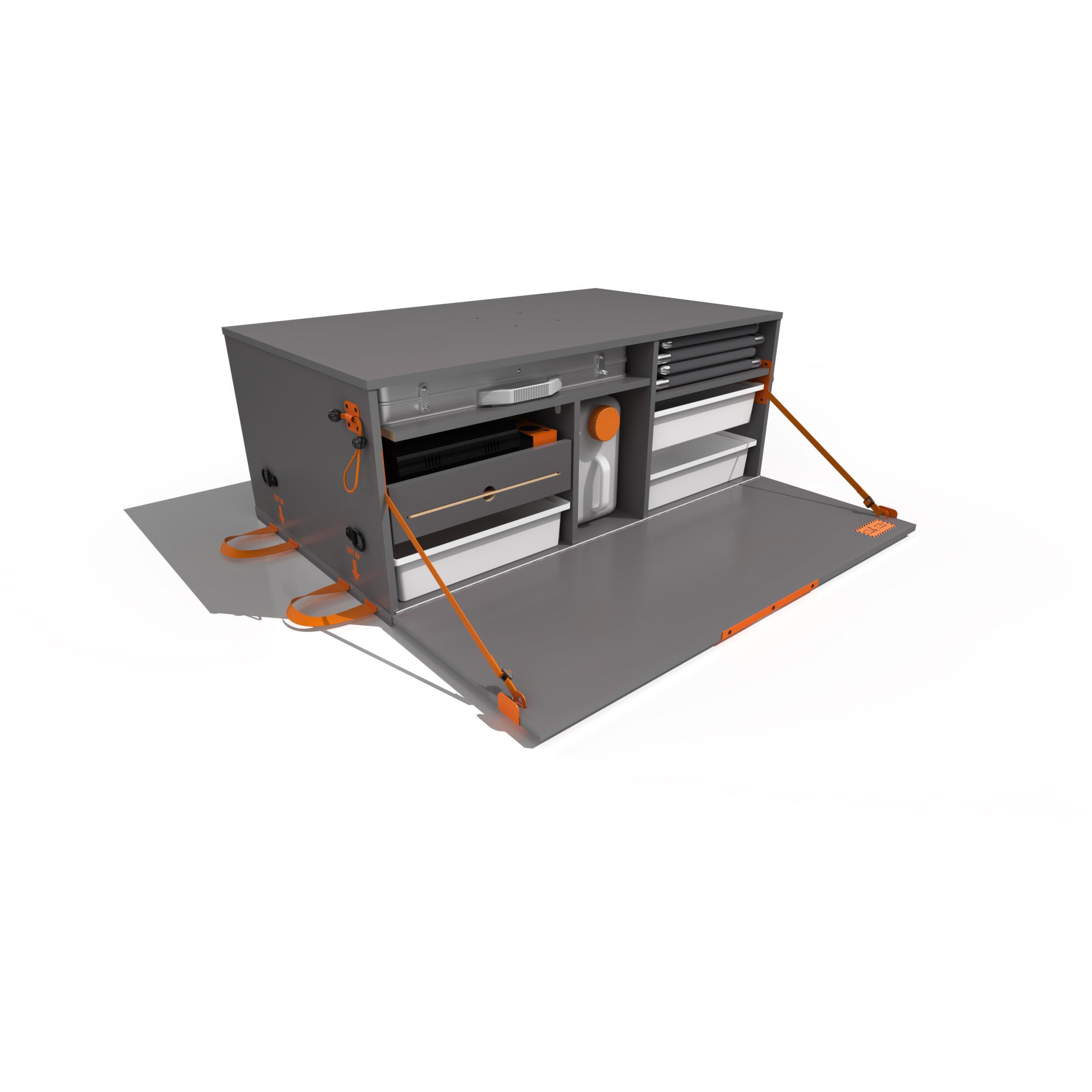 - Une table 1200 x 600 mm amovible sur pied aluminium, positionnée à l'intérieur de la malle.