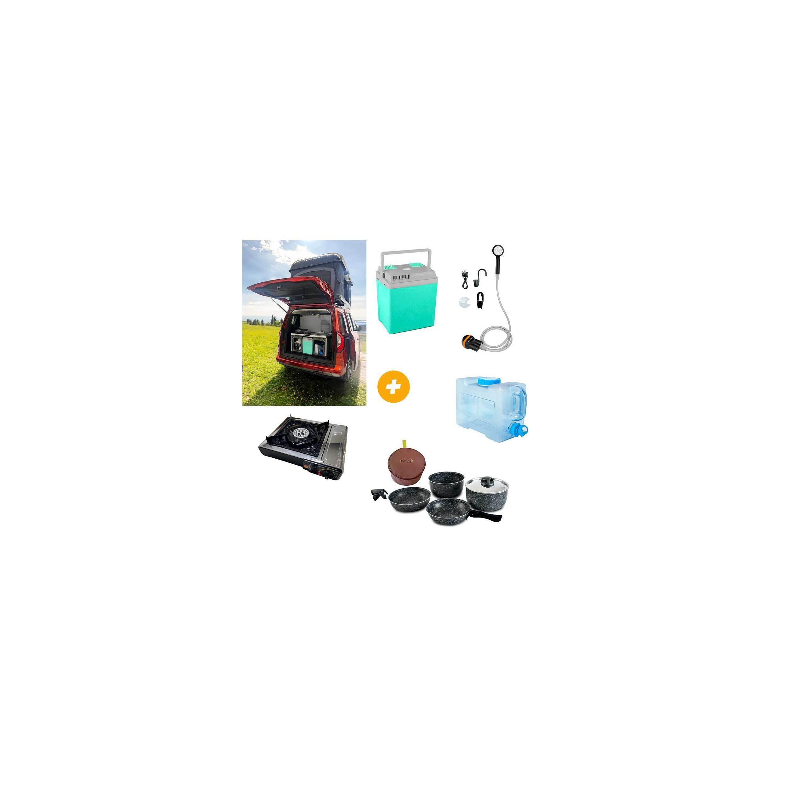 Le pack Kitch&Box 100 x 50 cm + Accessoires inclut tout le nécessaire pour une cuisine en plein air avec un meuble multifonction, une douche portable, un réchaud à gaz, un réservoir d'eau, une popote et une glacière thermoélectrique.