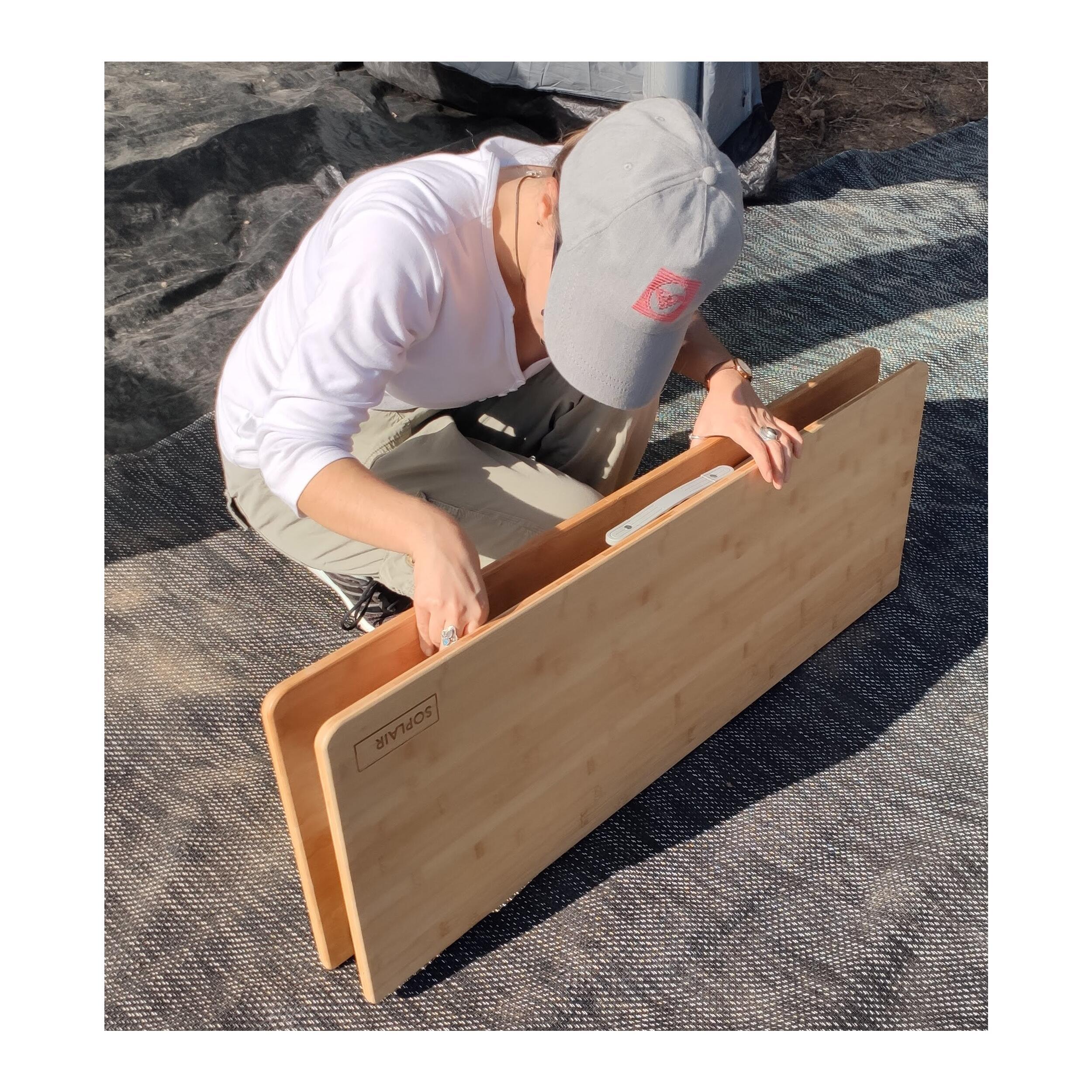 Elégante table avec plateau en bambou naturel, pratique, résistante et esthétique, idéale pour vos déjeuners en plein air. Pliable en deux et avec pieds en aluminium repliables sous le plateau, elle se replie facilement pour un rangement compact et rapide. Pratique poignée de transport pour l’emmener partout. Pieds ajustables pour s’adapter à tous les types de terrain.