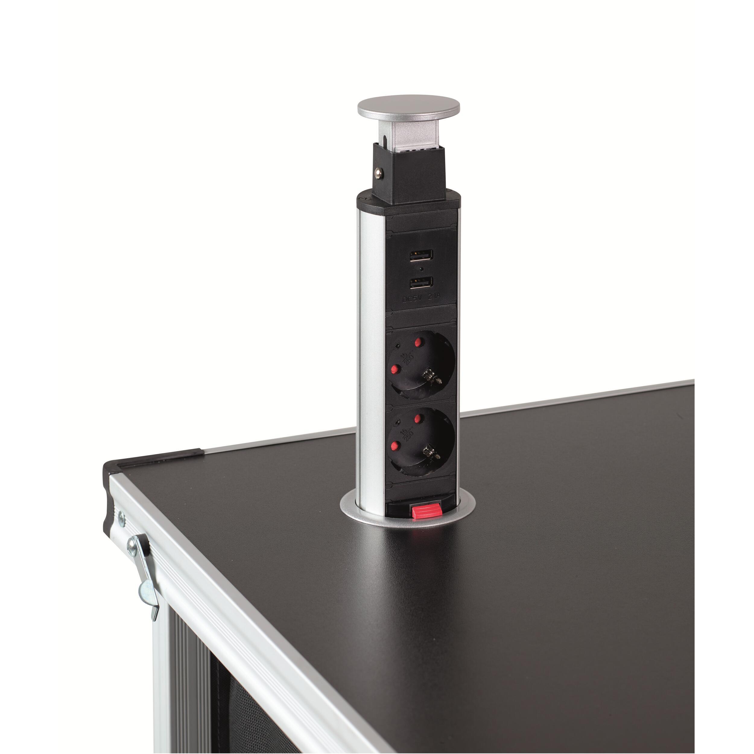 Dissimulée à l'intérieur de votre meuble, il vous suffit de la coulisser verticalement lorsque vous en avez besoin, que ce soit pour recharger vos téléphones et tablettes ou brancher votre cafetière ou votre grille pain. Pour armoires Isabella réf. 696953 et 696954.
