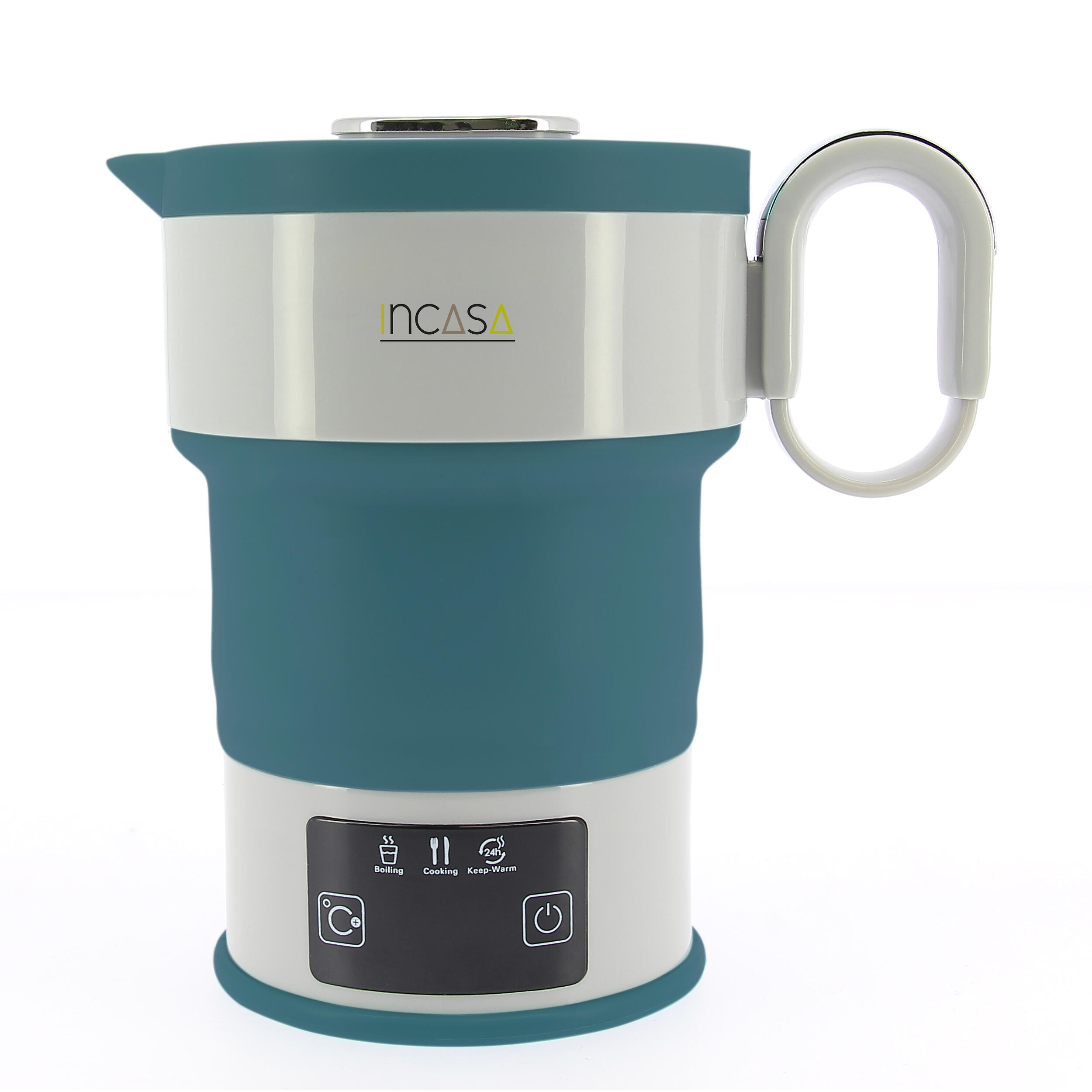 Bouilloire électrique rétractable INCASA 220 V de 0,6 L, compacte et facile à transporter, avec écran tactile, modes multifonctions et accessoires inclus.