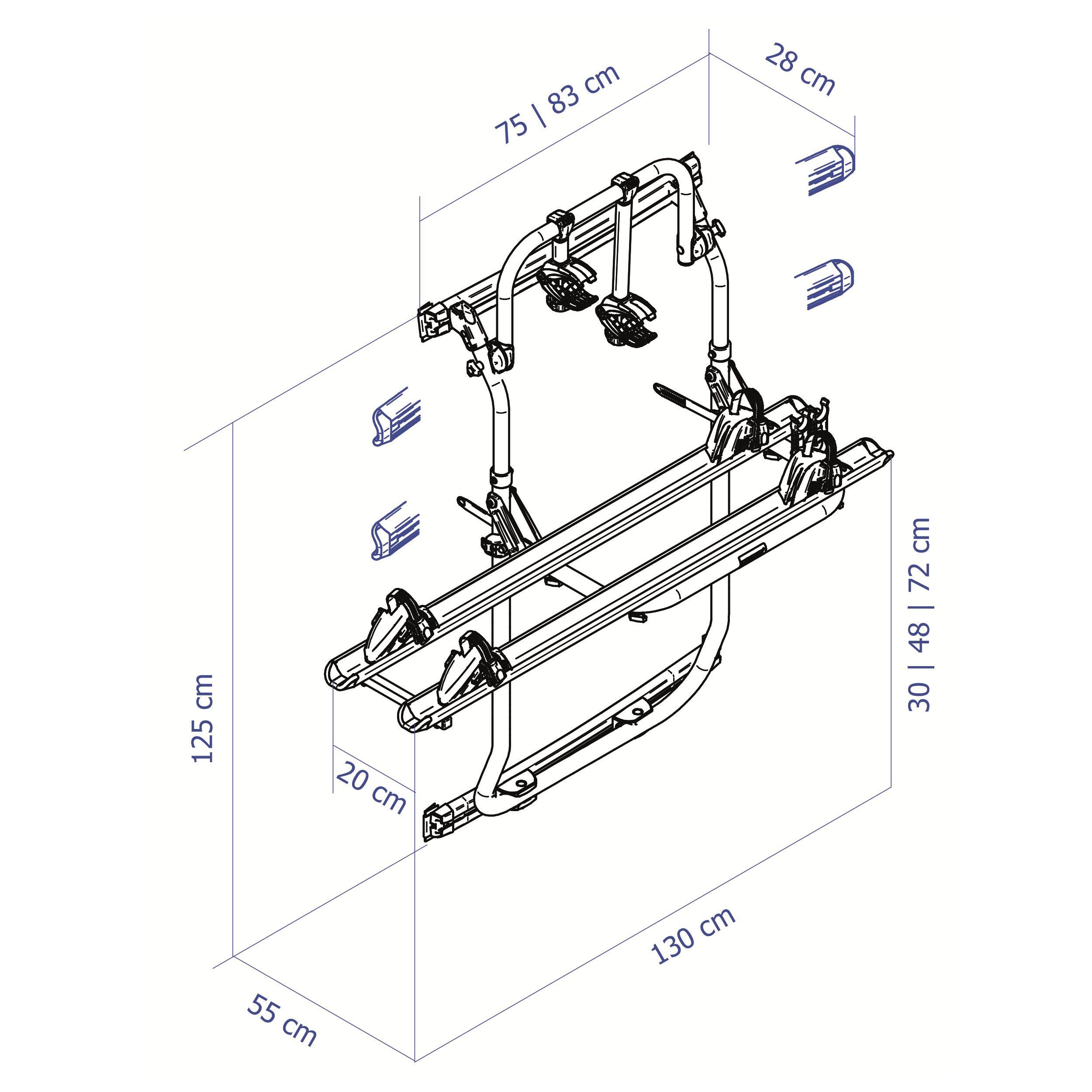 Les rails de support sont espacés de 20 cm, permettant un chargement facile même avec des vélos volumineux. Les sabots de roue sont réglables en longueur, s’adaptant à toutes les tailles de vélos, y compris certains modèles électriques grâce à une capacité de charge individuelle de 19 kg et une charge totale maximale de 35 kg.
