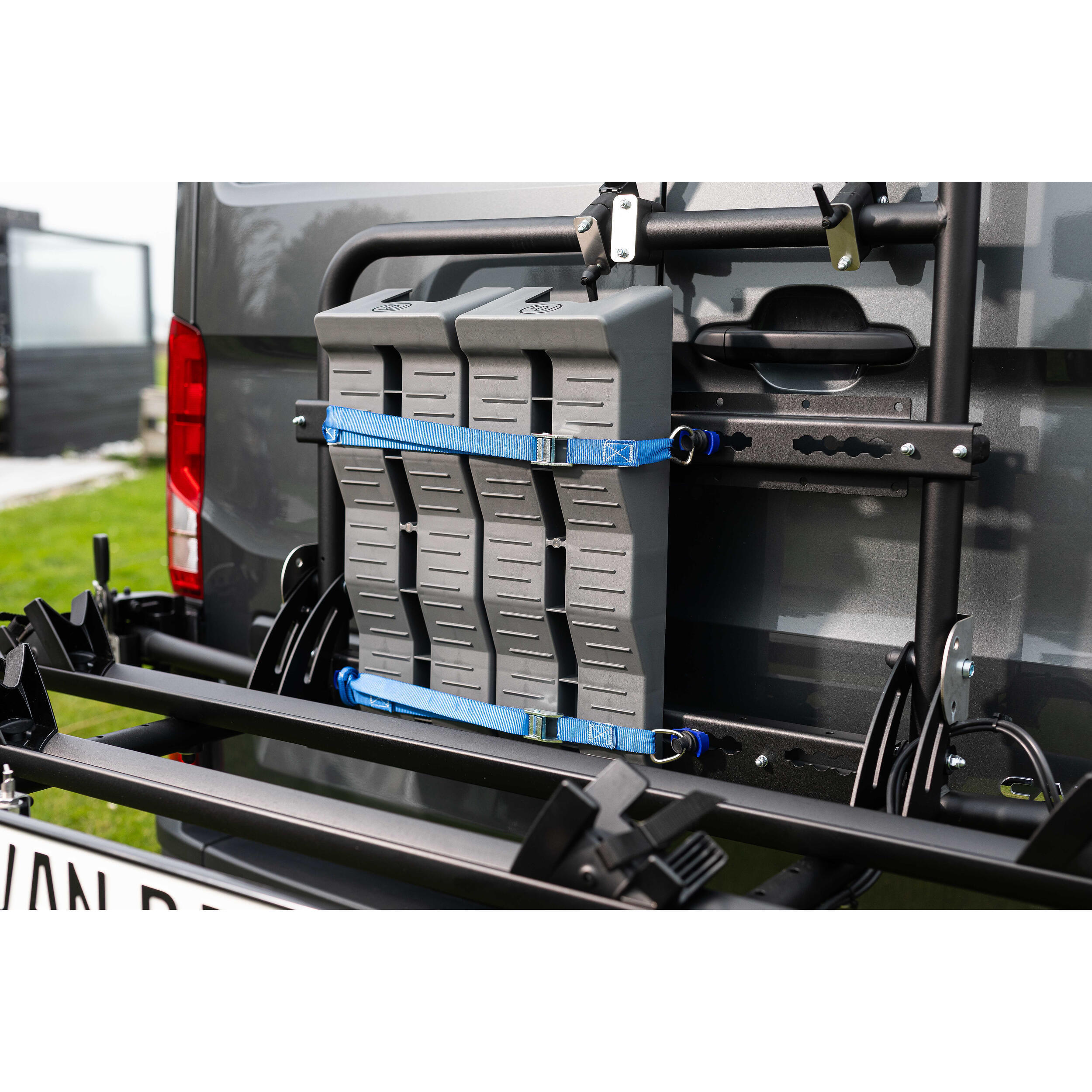 Support permettant de fixer et ranger une rampe de chargement sur porte-vélos Vanbike pendant le transport.