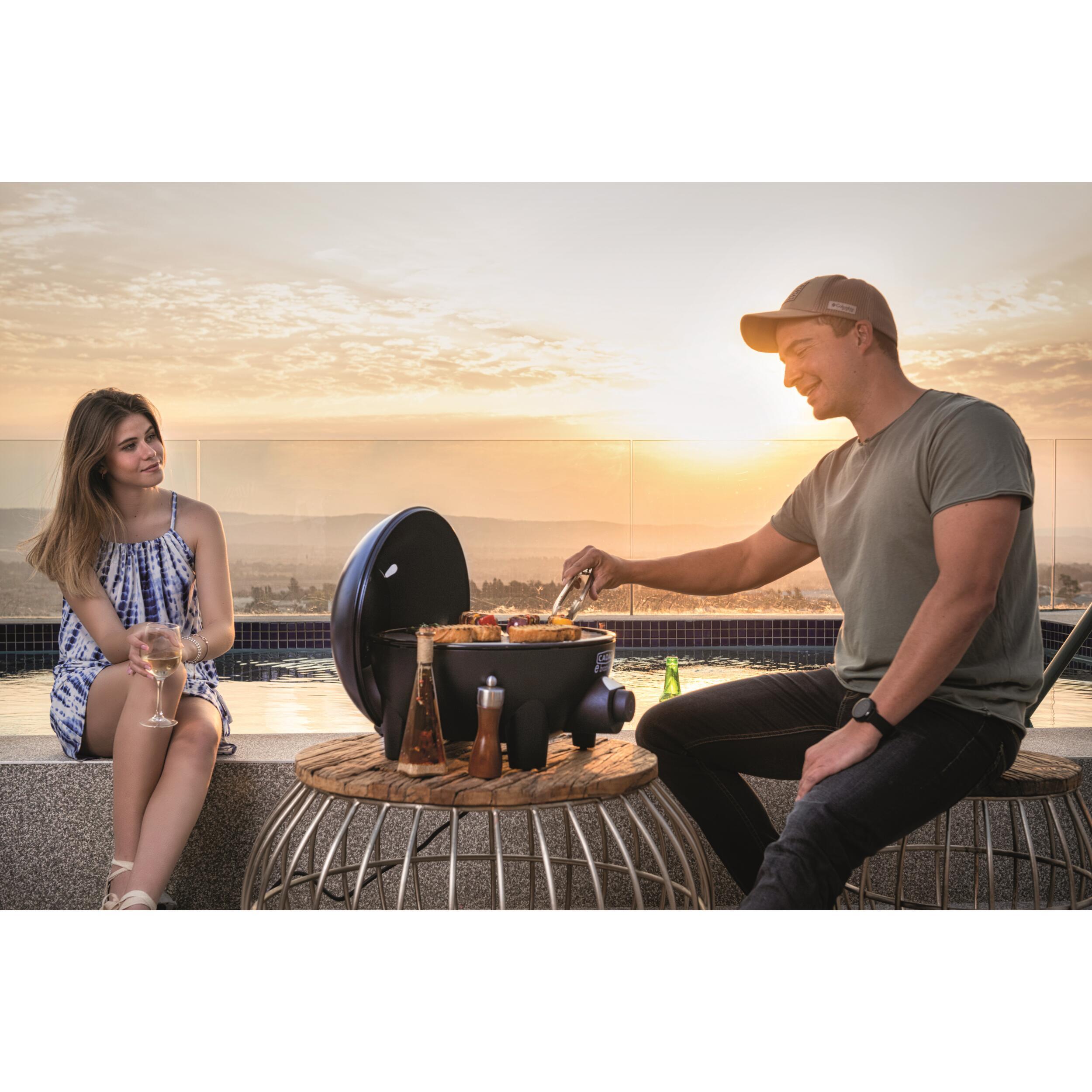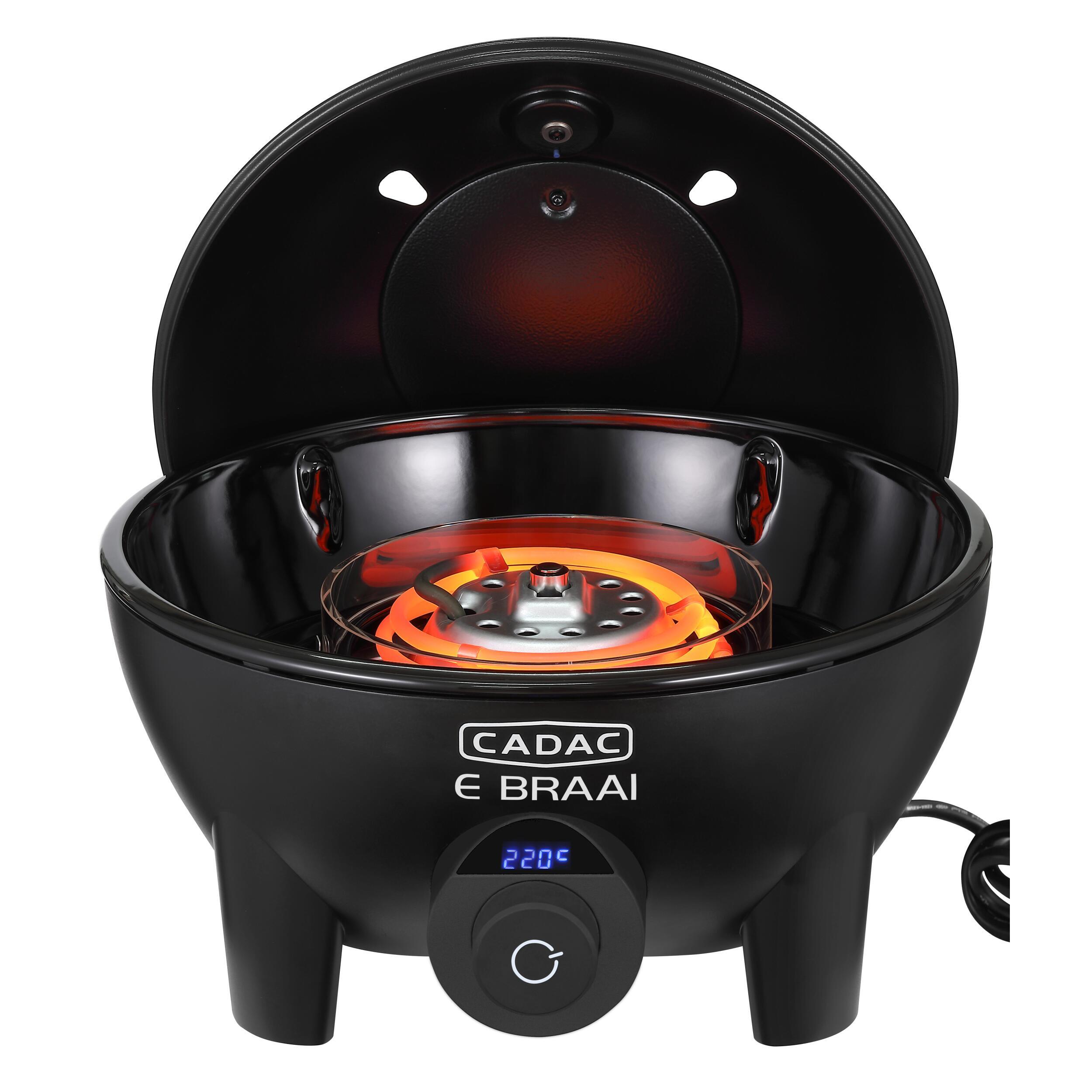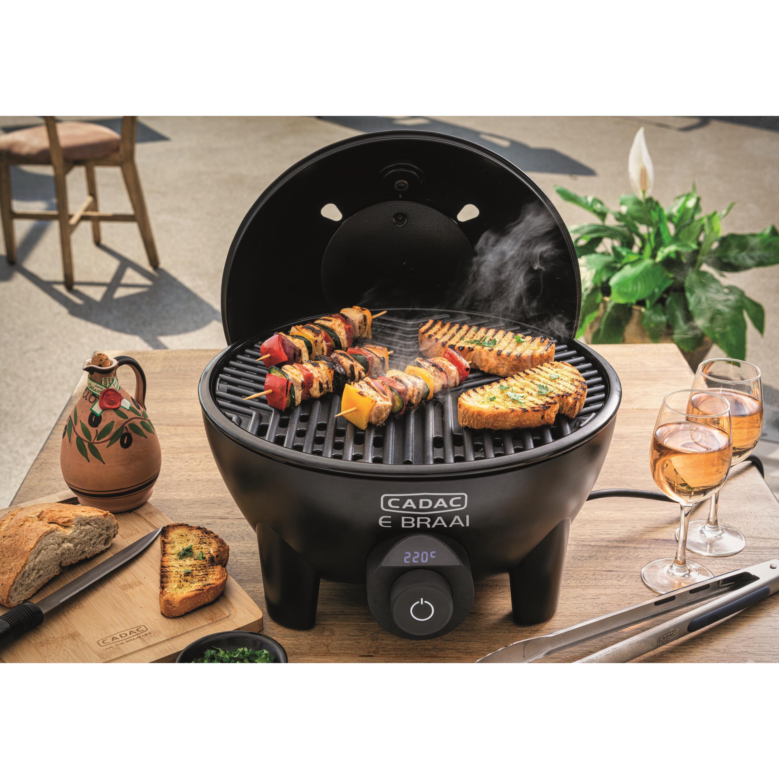 Barbecue électrique avec réglage précis de la température au moyen d'un affichage numérique clair. La température reste automatiquement à un niveau constant. Facile à nettoyer grâce au bac à graisse amovible. Le couvercle peut être accroché à l'arrière pour faire office de un pare-vent ou pour protéger des éclaboussures. Il est composé d’une grille barbecue avec revêtement antiadhésif Greengrill, d’un support de casserole et d’un couvercle de cuisson.