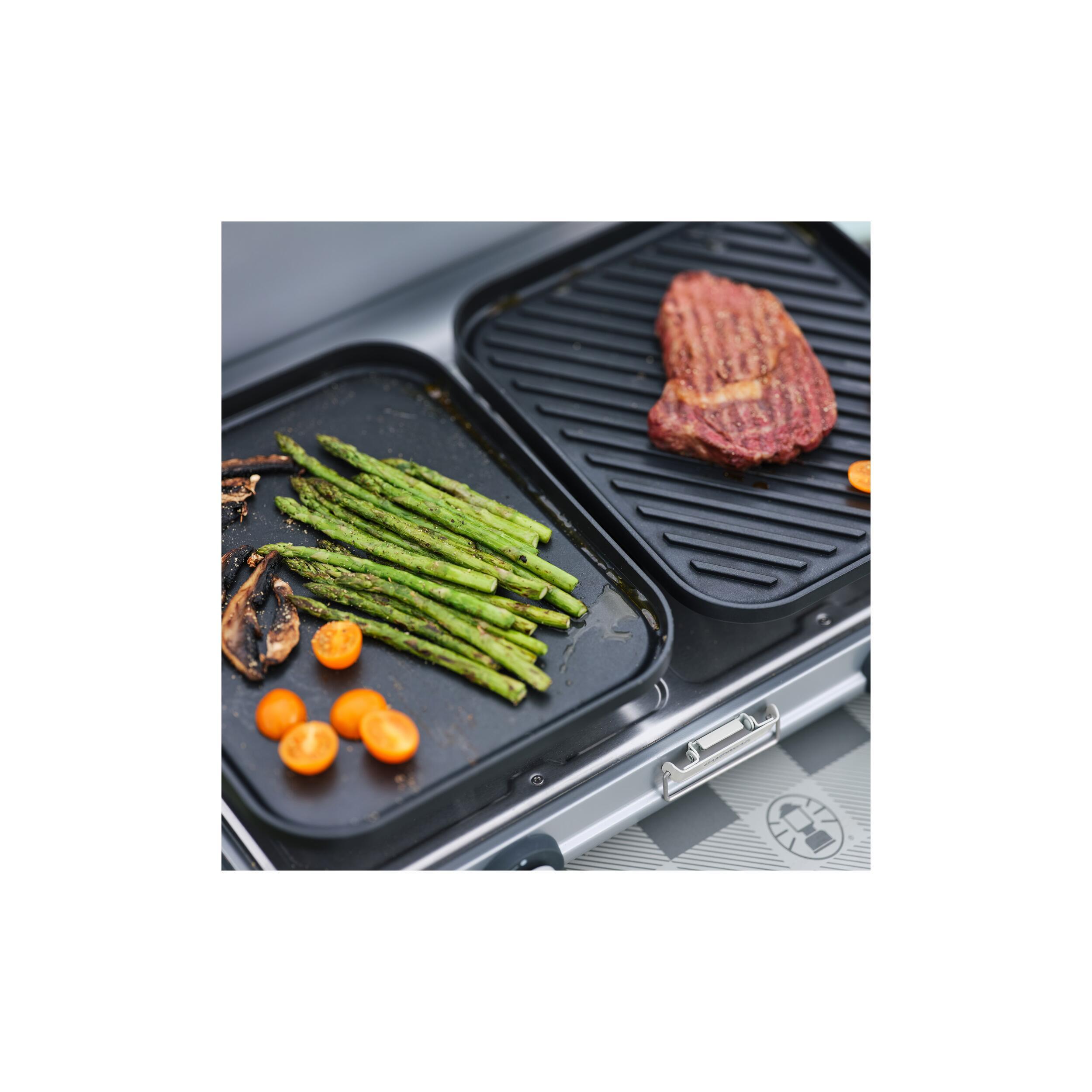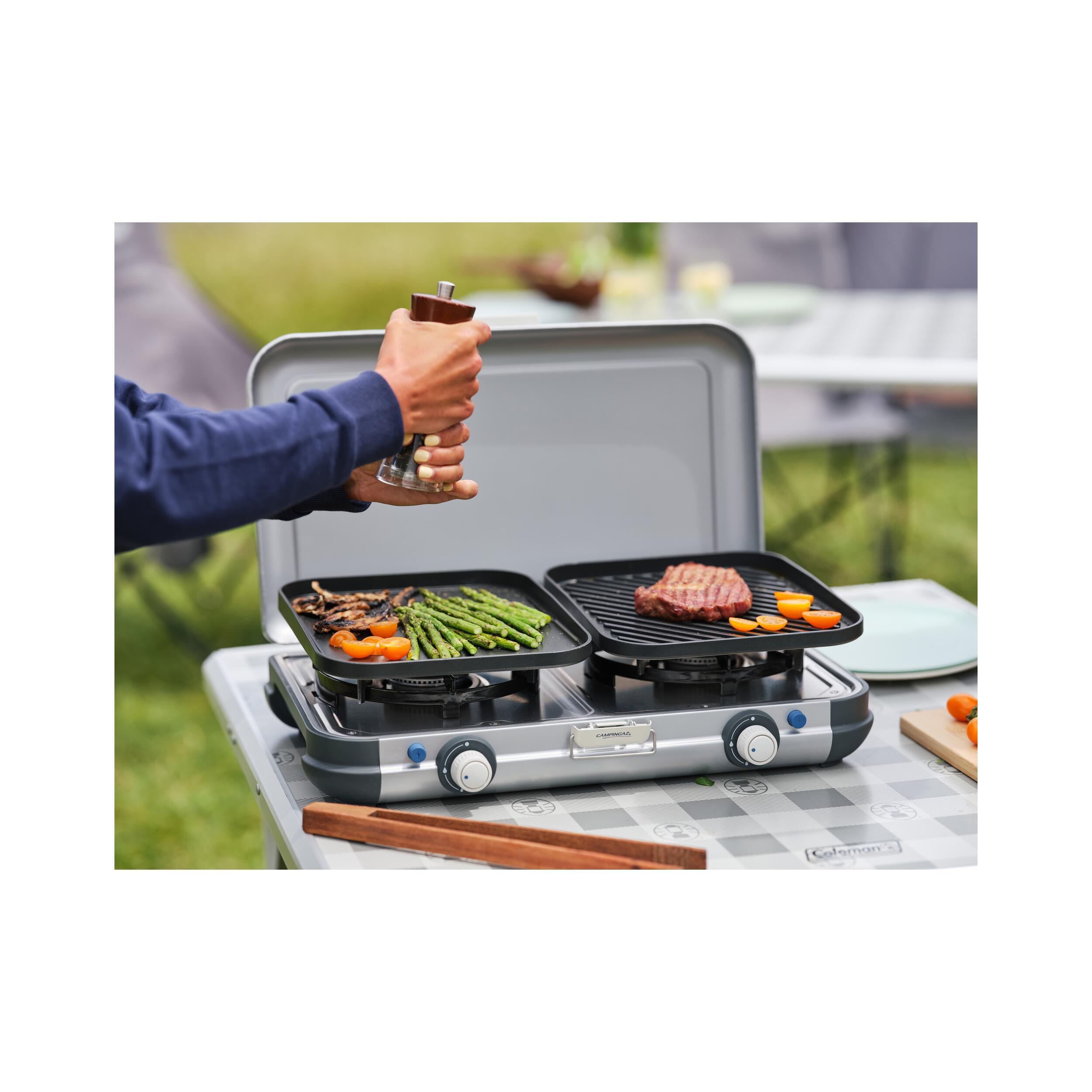 Le Camping Kitchen 2 Grill & Go R est un réchaud 2 feux polyvalent, avec grill, plancha et supports de casseroles interchangeables. Compact et transportable, il fonctionne sur bouteille de gaz.