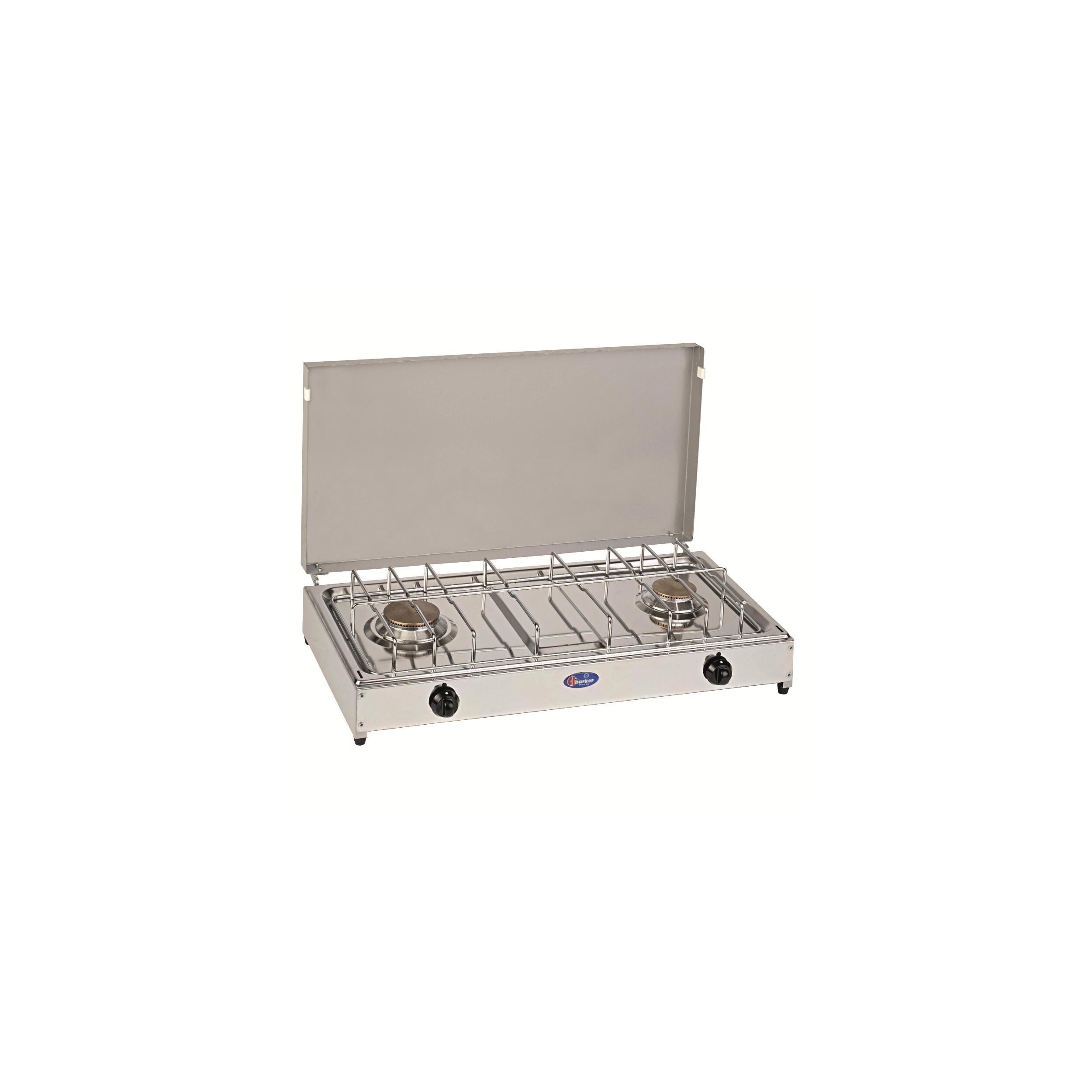 Réchaud à gaz avec plan en acier inox, brûleurs en alliage Pyral N2, chapeaux des brûleurs en laiton massif, grille en acier chromé. Couvercle pare-feu, débit de gaz réglable. Raccordement à la bouteille de gaz butane ou propane avec un raccord tétine (tuyau flexible et détendeur non fournis).Raccord tétine.