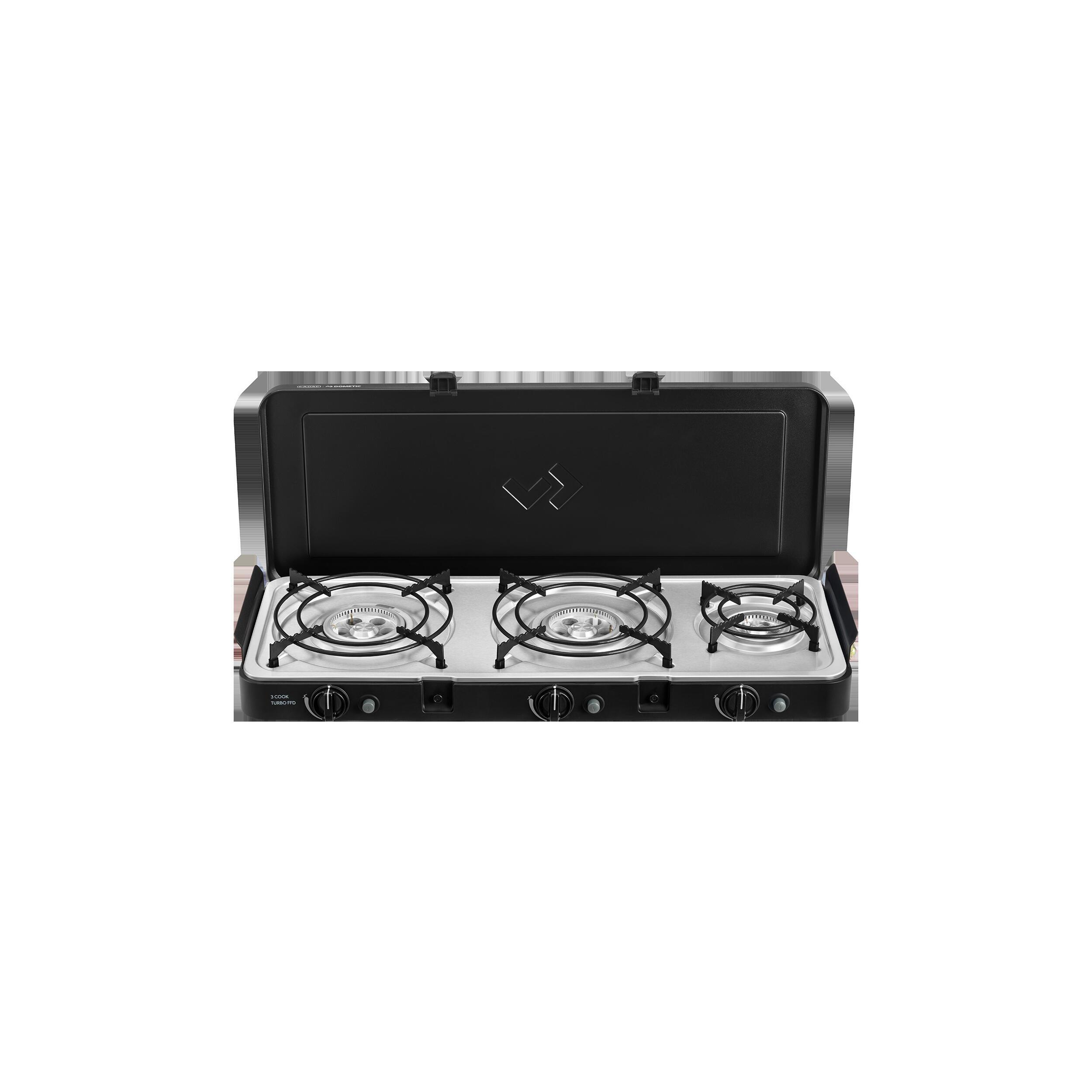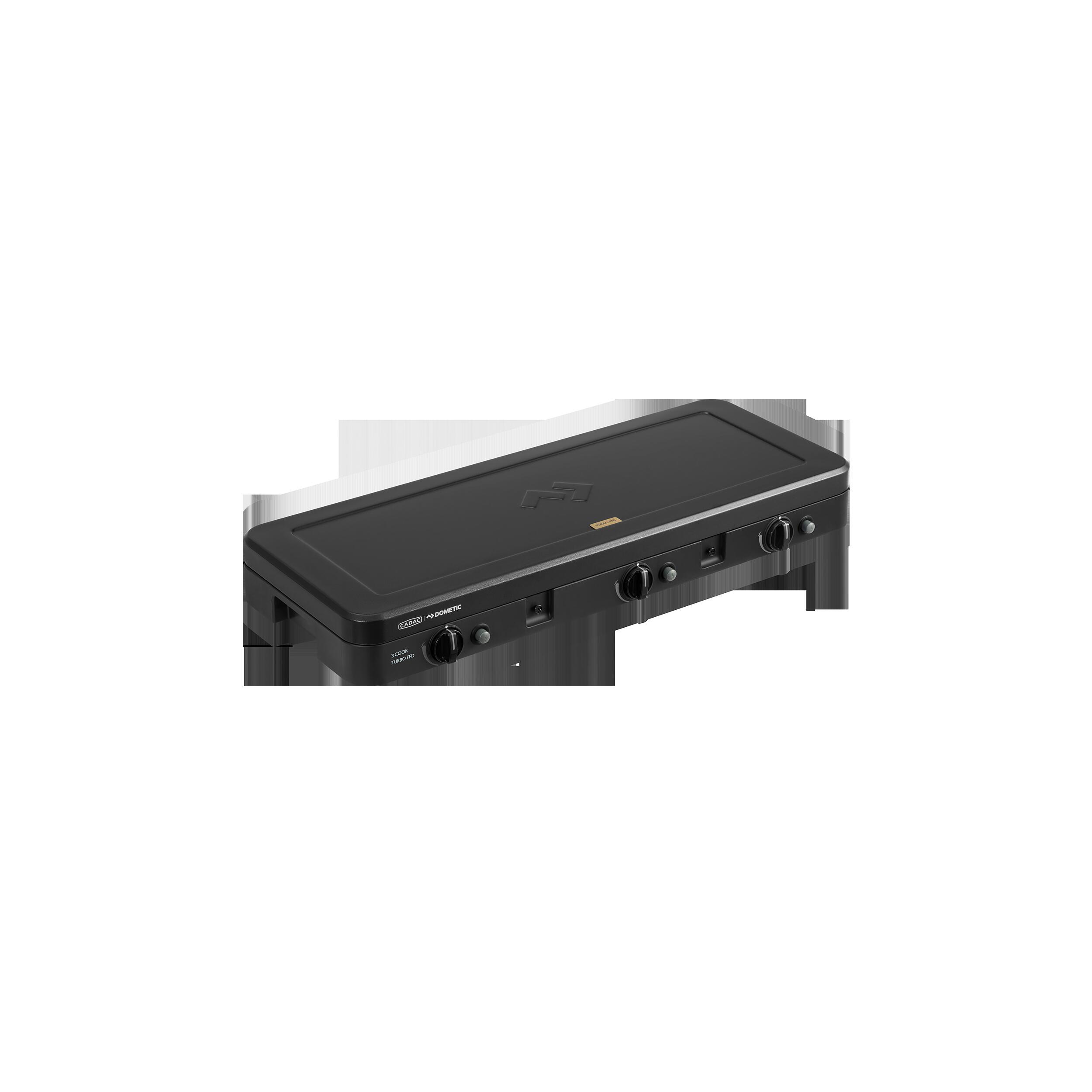 Le 3-Cook Turbo FFD Deluxe de CADAC offre 3 brûleurs, une grille, un grill et des supports de casseroles. Avec revêtement GreenGrill et pare-vent, il assure une cuisson polyvalente, stable et compacte.