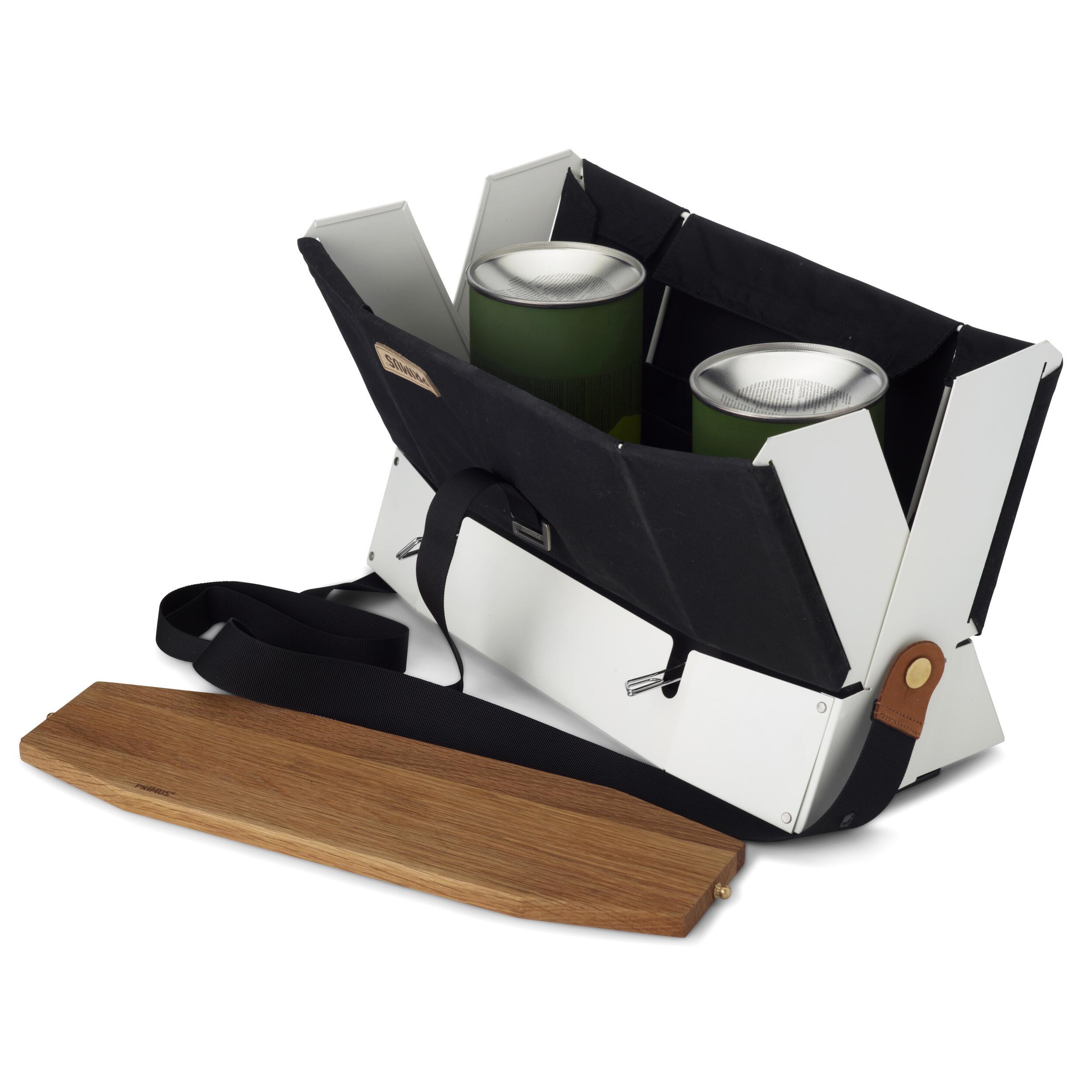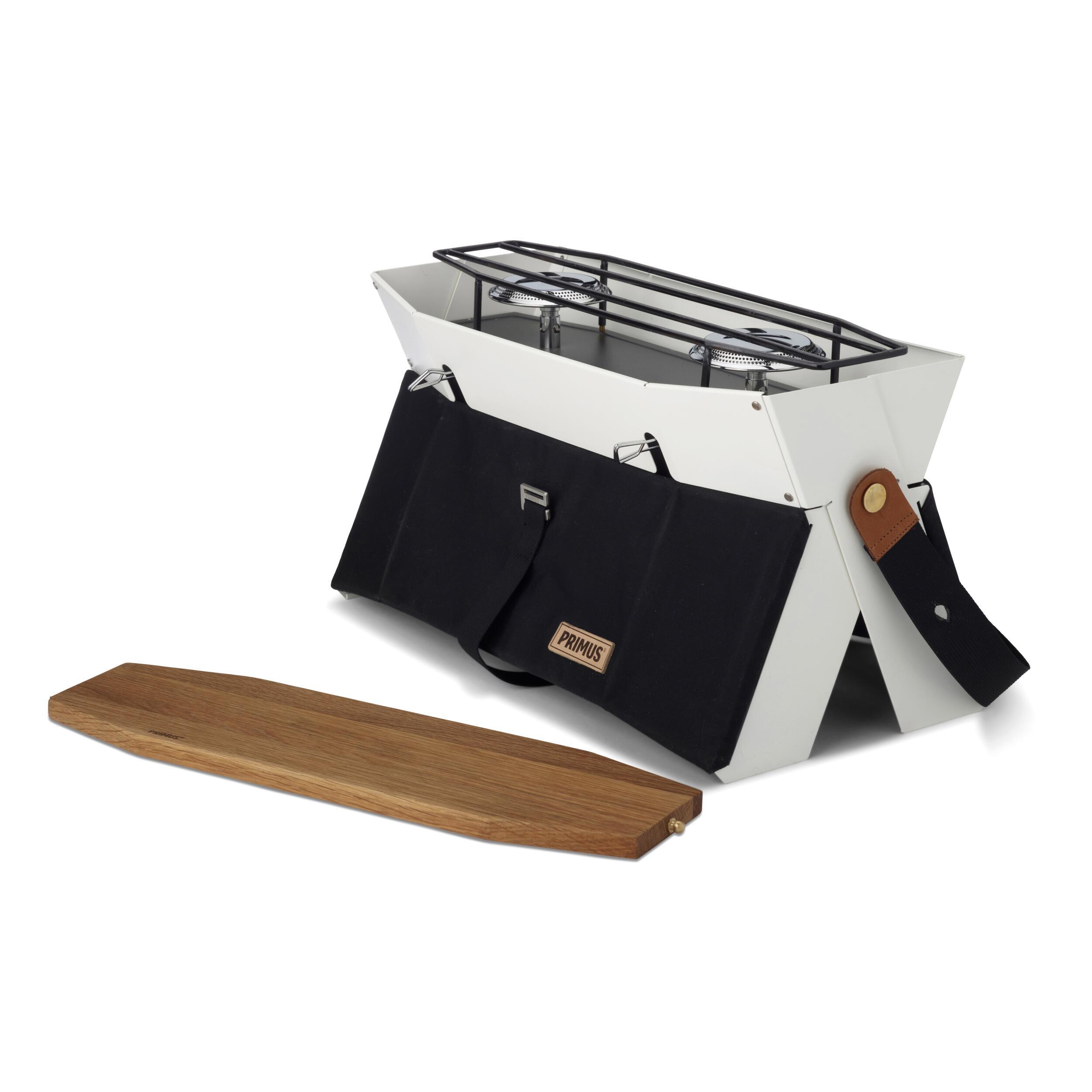 Ce réchaud à 2 brûleurs design et compact vous facilite la vie. Avec une base en tissu amovible et facilement lavable, un couvercle en chêne qui sert également de planche à découper et un branchement à deux cartouches de gaz simultanément.