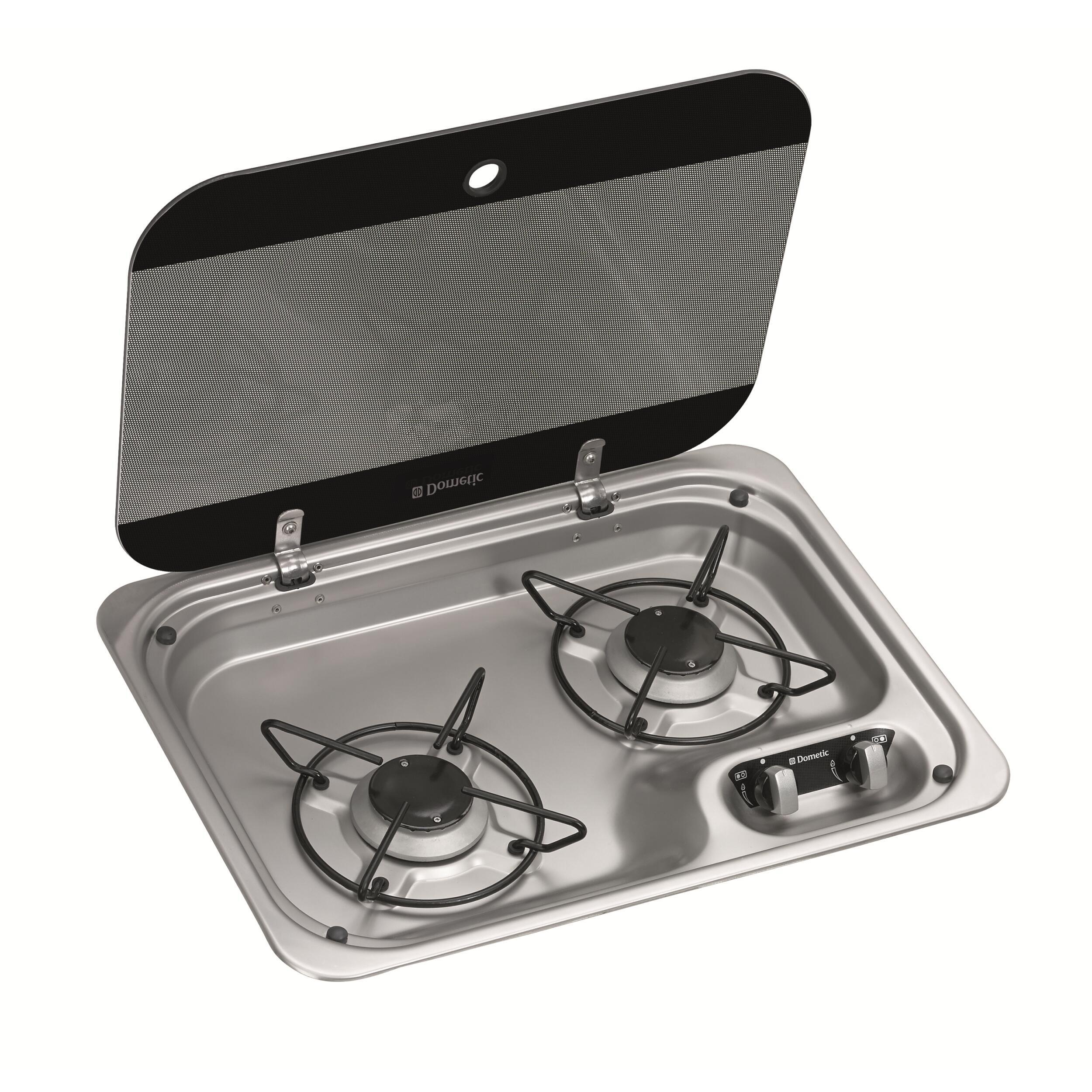 Réchaud encastrable en inox avec couvercle en verre trempé résistant à la chaleur. Grilles amovibles pour faciliter le nettoyage. Chapeau des brûleurs en acier inox. Allumage manuel.