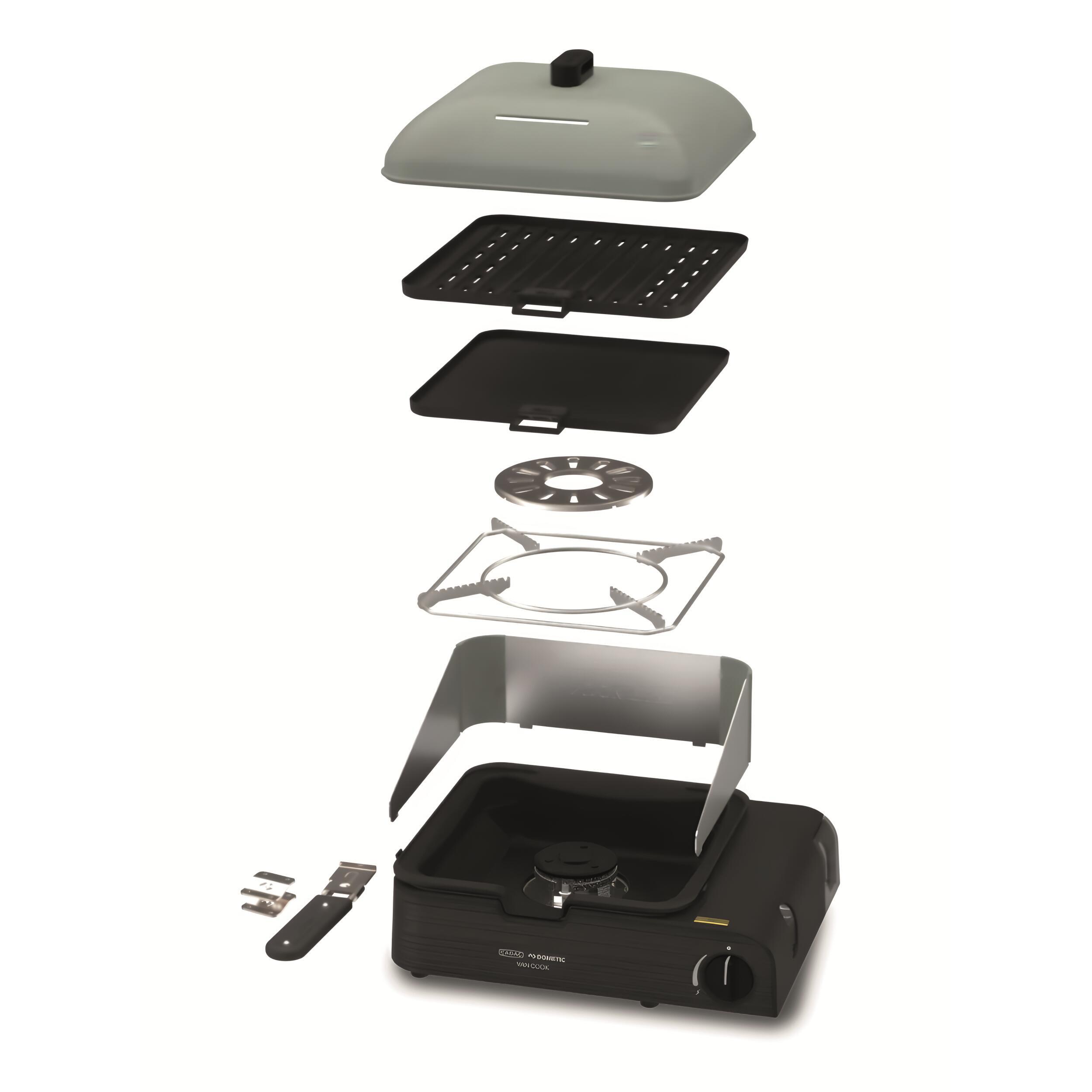 Comprend : un support pour casserole, une plaque de barbecue, une poignée amovible, un support pour cafetière, une protection anti-éclaboussures, un dôme et un sac de transport.