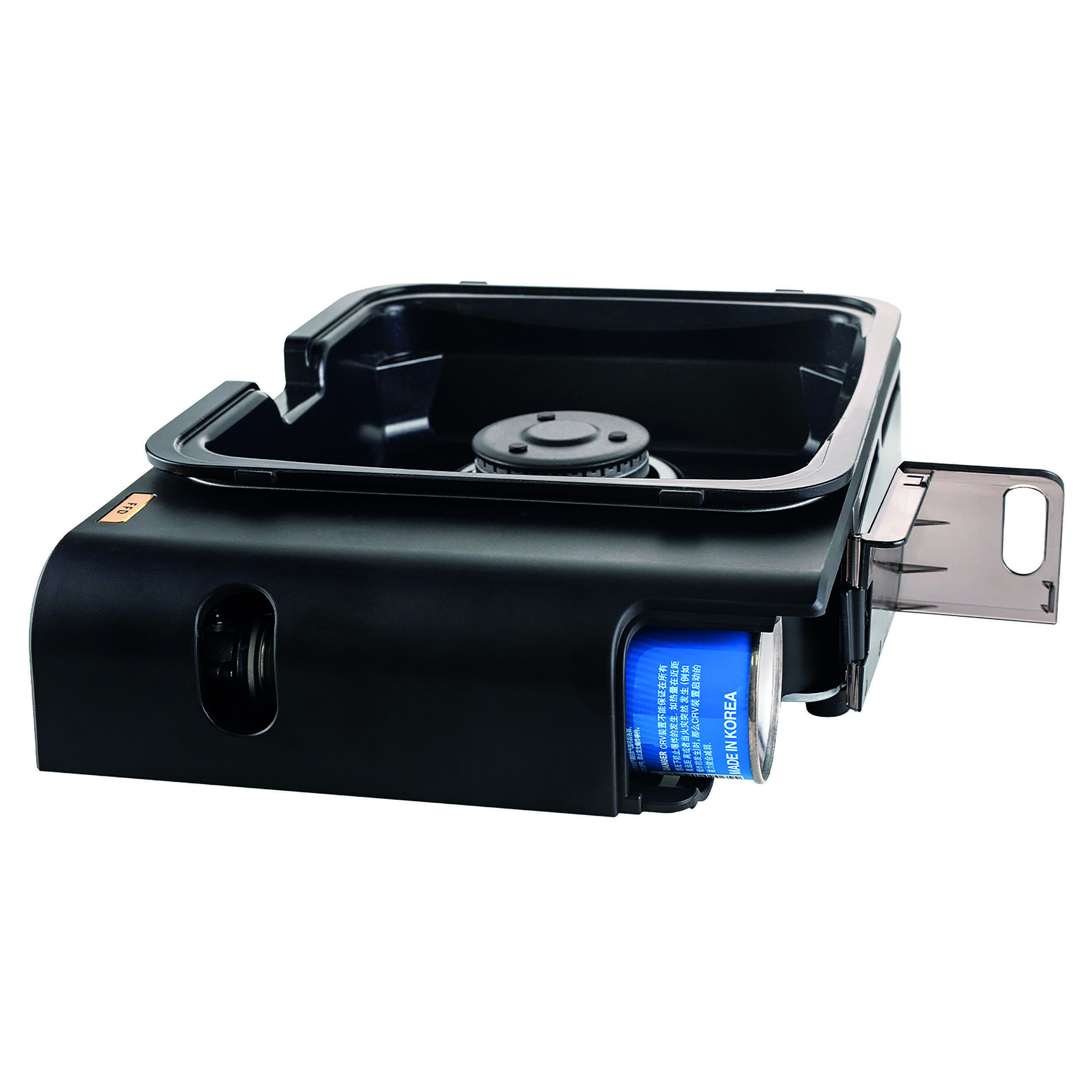 Ce modèle comprend un support pour casserole, une plaque de barbecue, un support pour cafetière, une protection antiéclaboussures ainsi qu’une poignée amovible. Un sac de transport est également inclus.