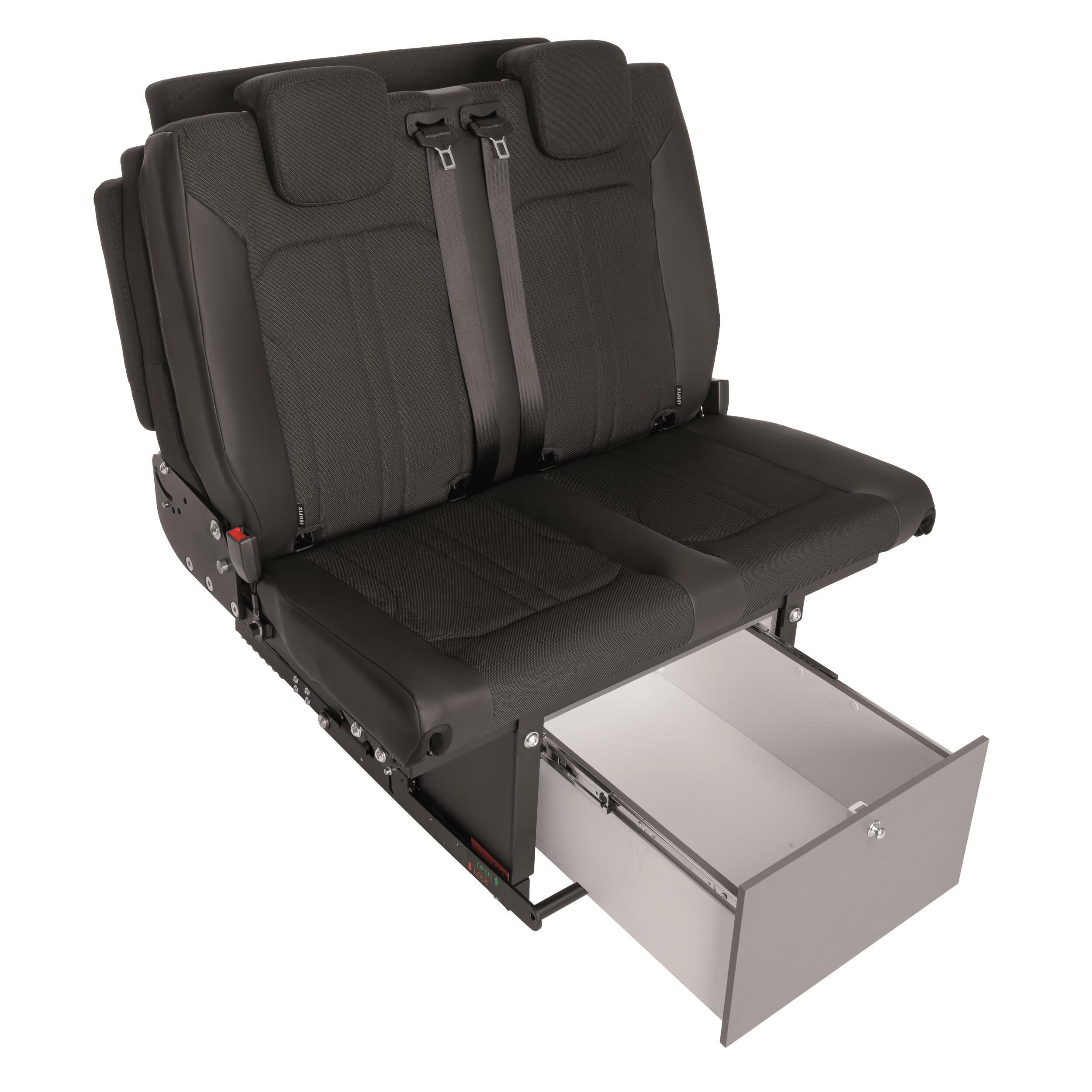 Le tiroir de rangement est spécialement conçu pour s’adapter aux modèles 2 et 3 passagers, offrant ainsi une solution de stockage intelligente et robuste. Idéal pour les artisans, techniciens ou autres professionnels en déplacement, il permet de garder les outils et équipements bien organisés et facilement accessibles. Son design discret sous la banquette maximise l’espace disponible sans encombrer l’habitacle.