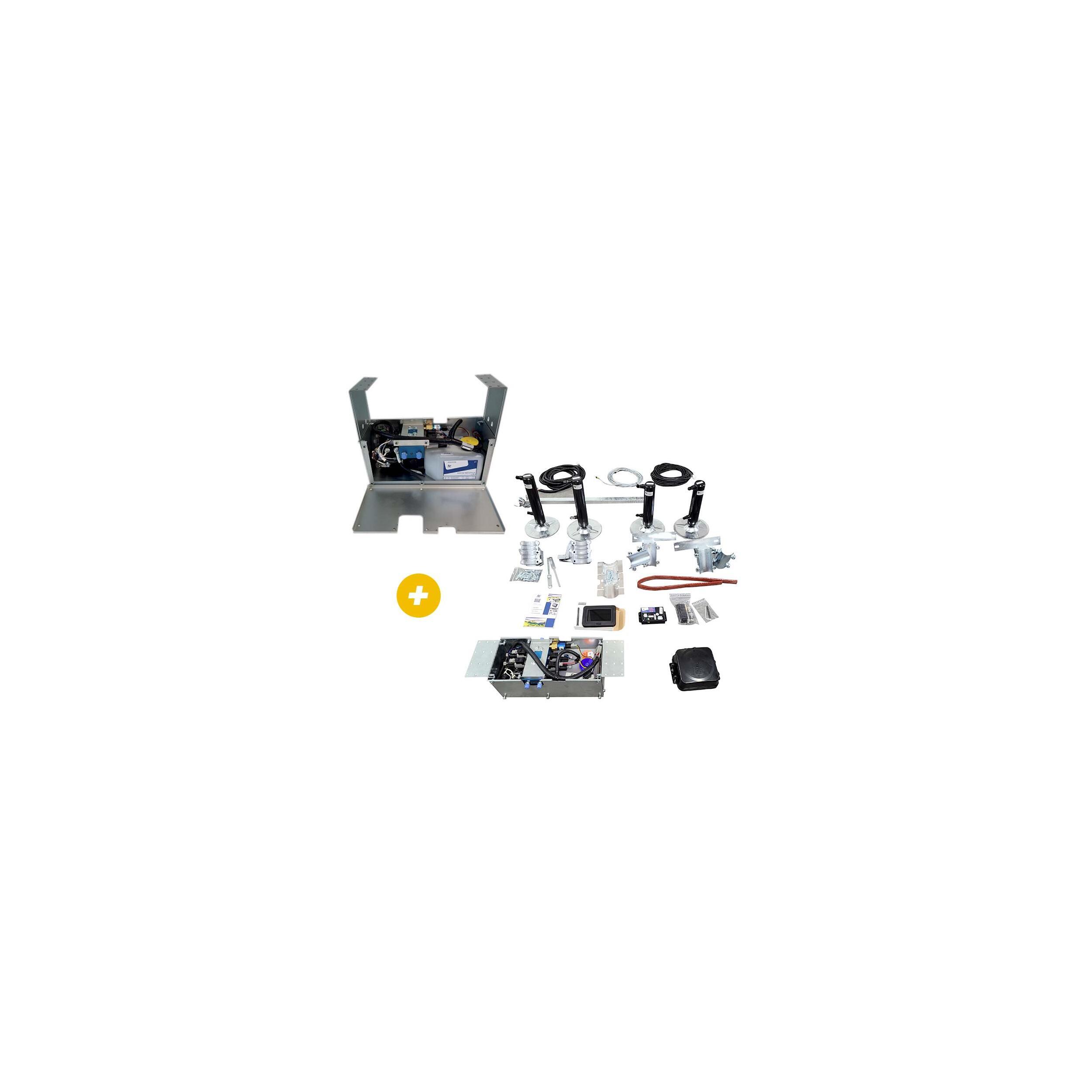 Le groupe hydraulique et le calculateur peuvent être installés à l'intérieur pour les camping-cars ou sous le châssis en option. Pour les fourgons, l'installation se fait directement sous le châssis. Ce choix d'installation permet d'optimiser l'espace disponible et de protéger les composants des intempéries et des chocs.