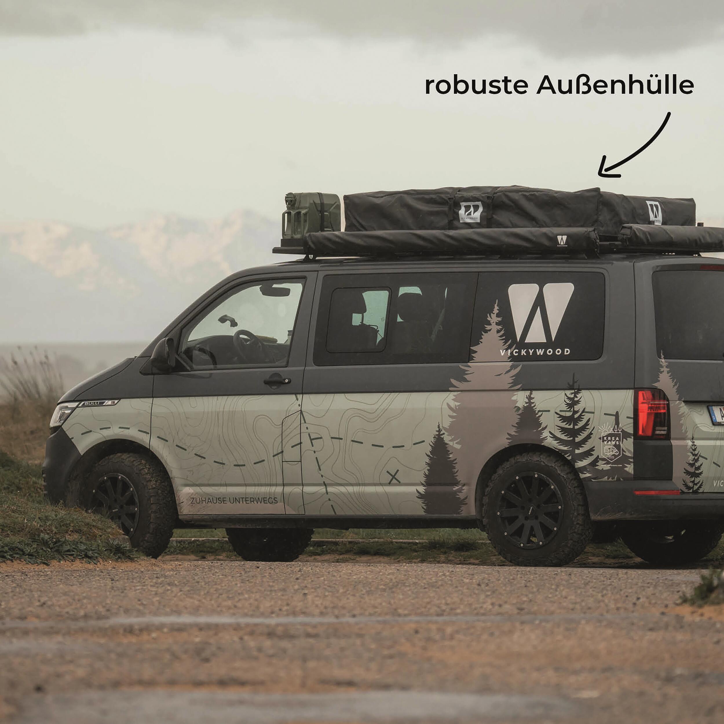 Les tentes de toit Vickywood utilisent un maximum de matériaux recyclables. Le tissu intérieur en polycoton 320g résistant aux déchirures, régule parfaitement l'humidité, le coton absorbe l'humidité de l'intérieur de la tente, le polyester l'évacue vers l'extérieur.