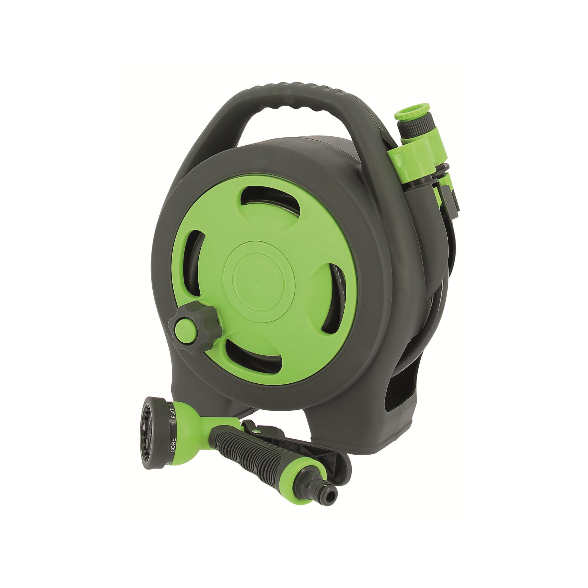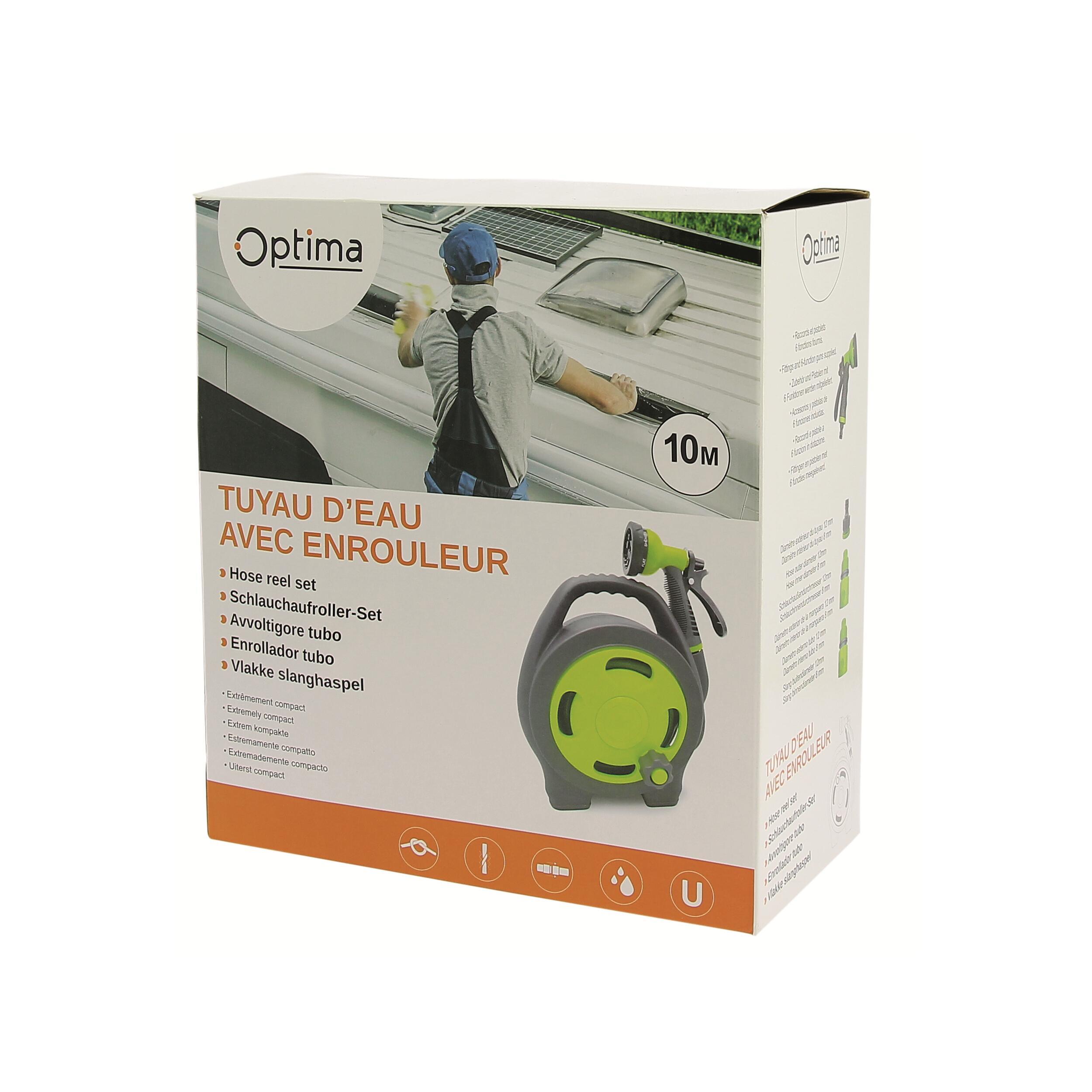 Tuyau d’eau 10 m avec enrouleur compact Optima, idéal pour le remplissage du réservoir ou le nettoyage du véhicule, avec pistolet multifonction 6 jets.