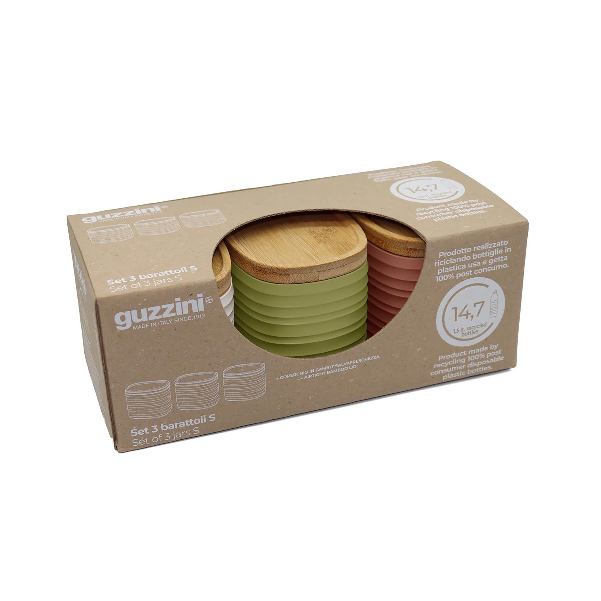 Sublimez votre cuisine avec ce lot de 3 boîtes Tierra de Guzzini. Fabriquées à partir d'environ 15 bouteilles recyclées, elles combinent esthétique et durabilité, avec des couvercles en bambou pour une conservation optimale.