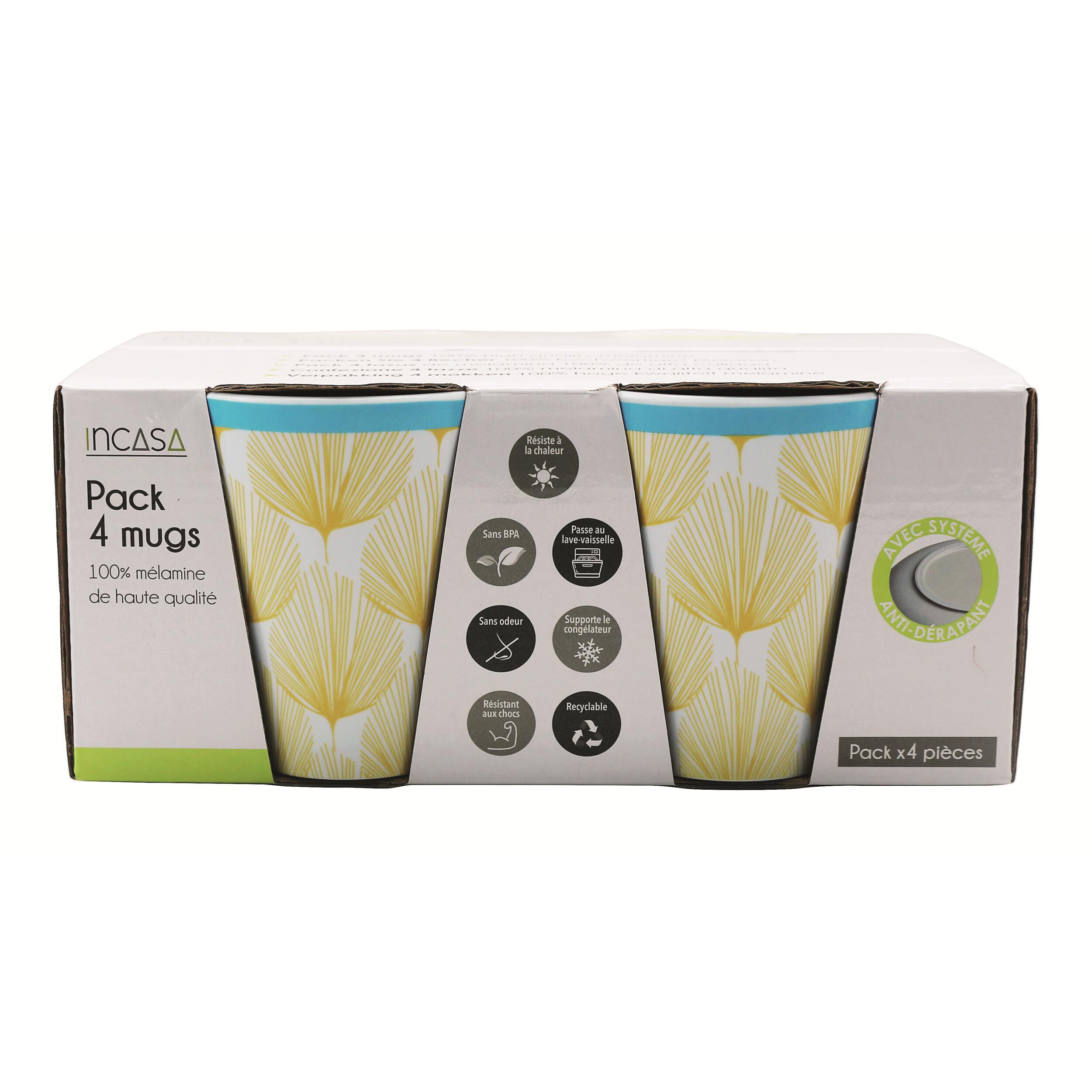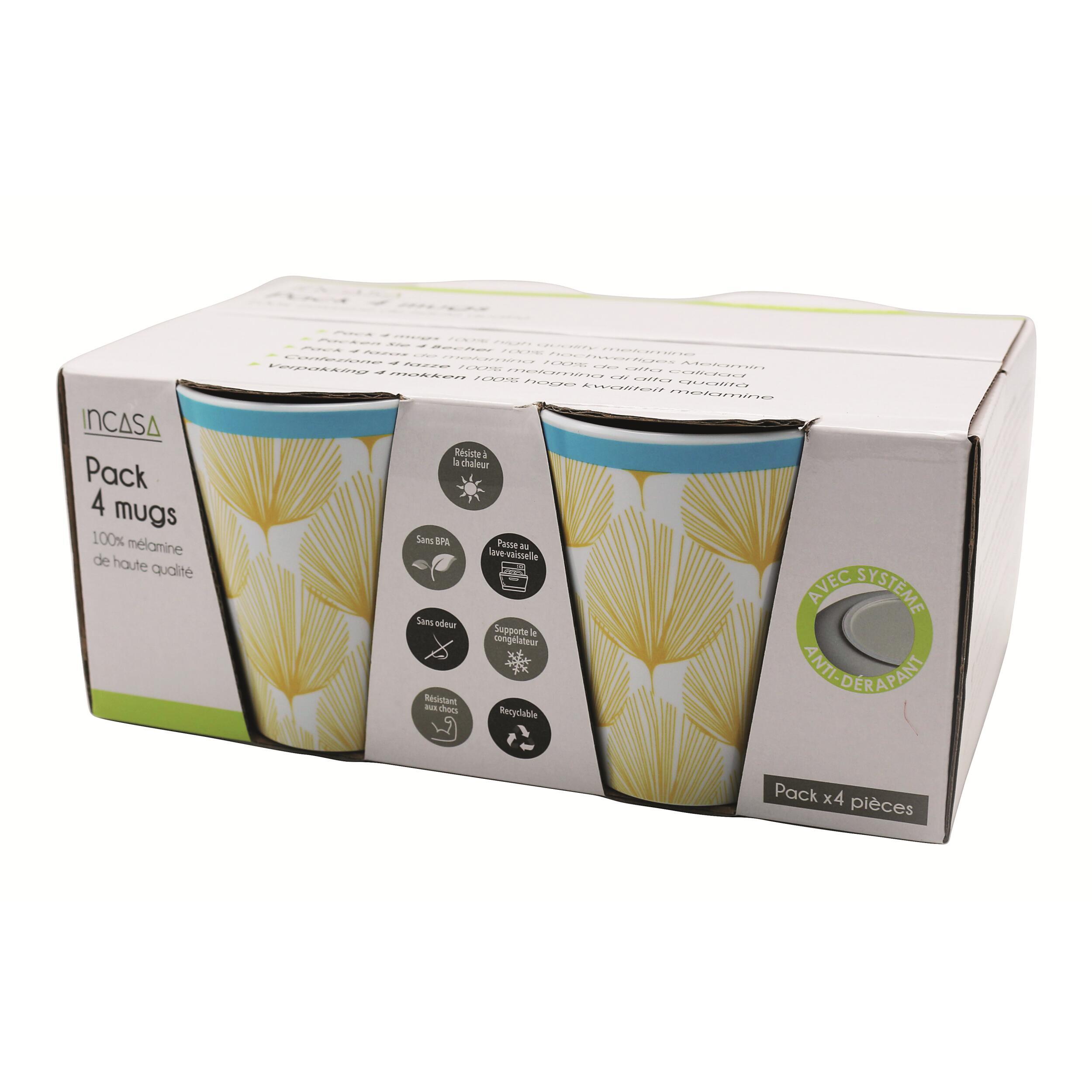 Ce set de 4 mugs en 100% mélamine de grande qualité est doté d'un système antidérapant pour éviter de glisser et réduire le bruit. Il est idéal pour les petits déjeuners en camping-car, caravane, fourgon et bateau. Il ne craint pas les rayures et passe au lave-vaisselle.