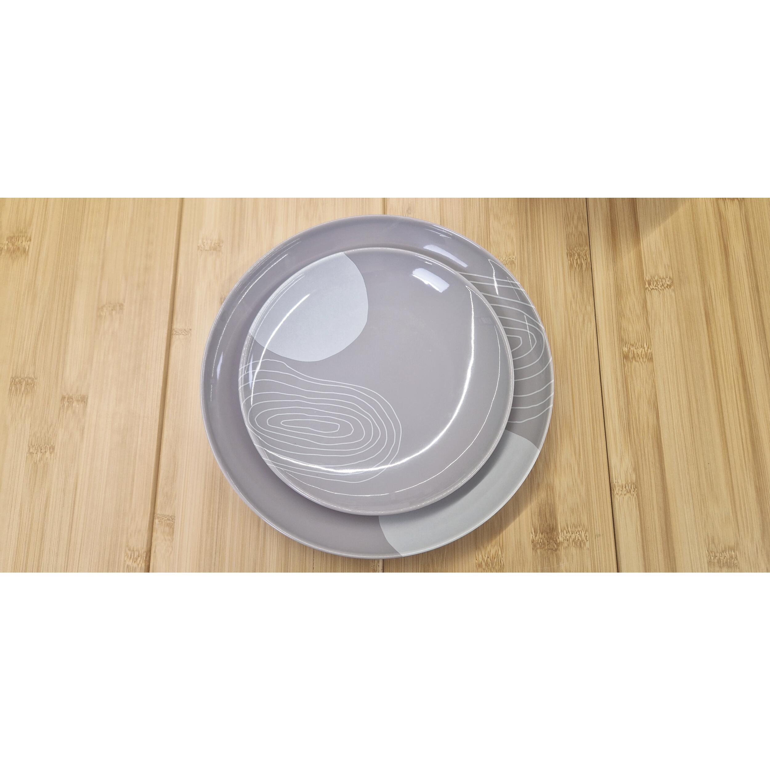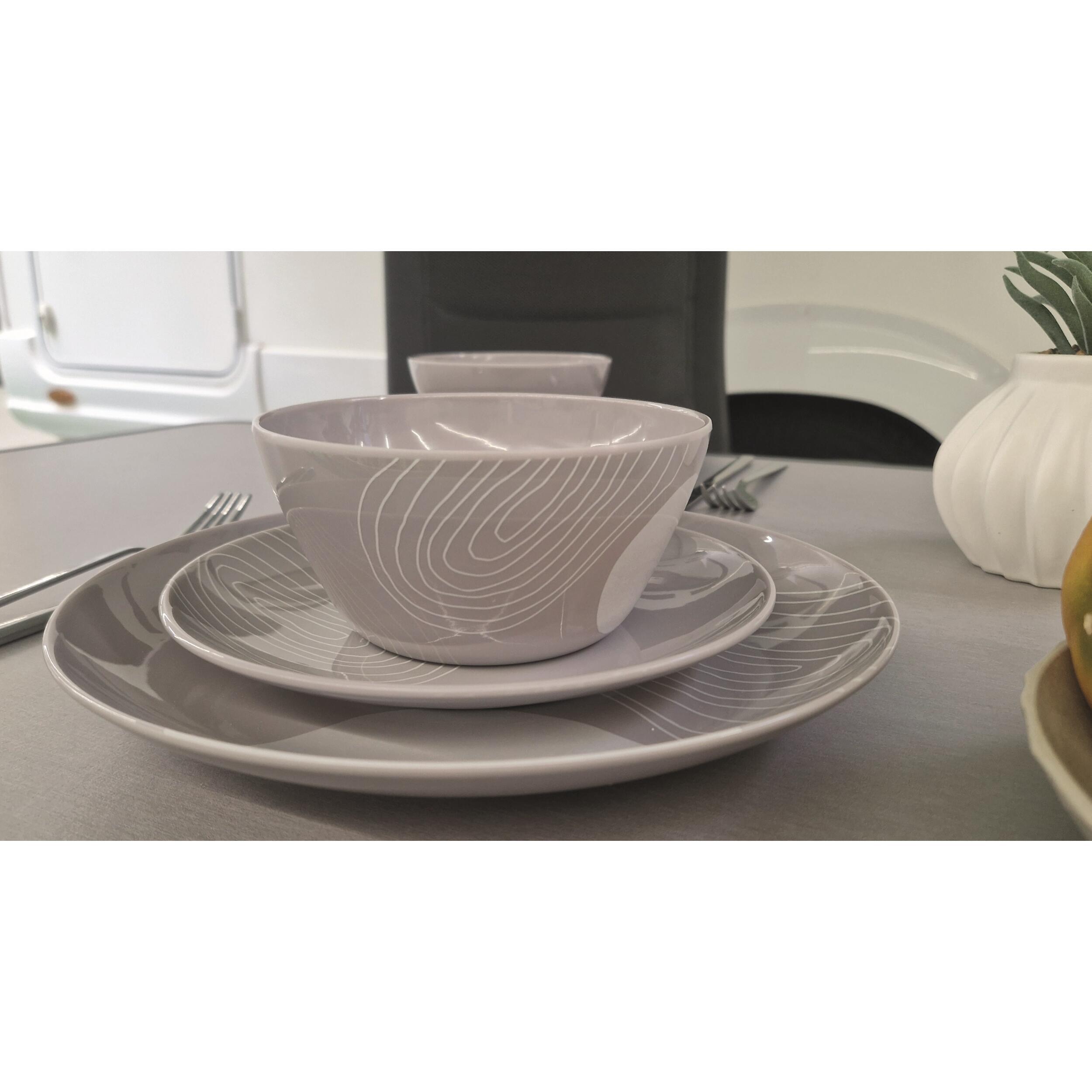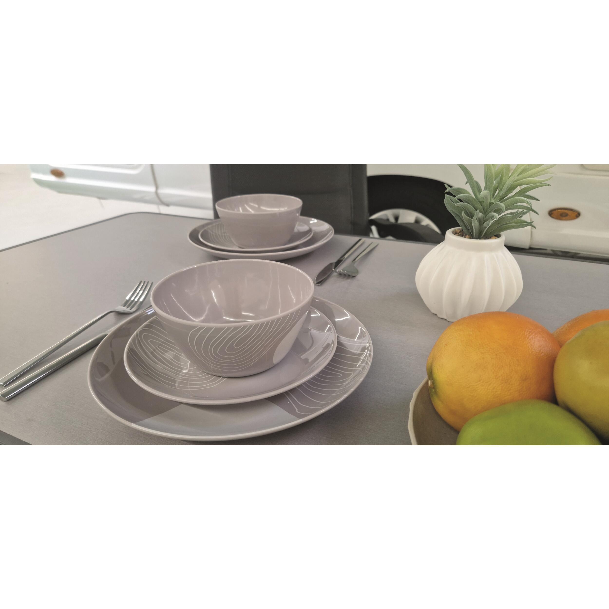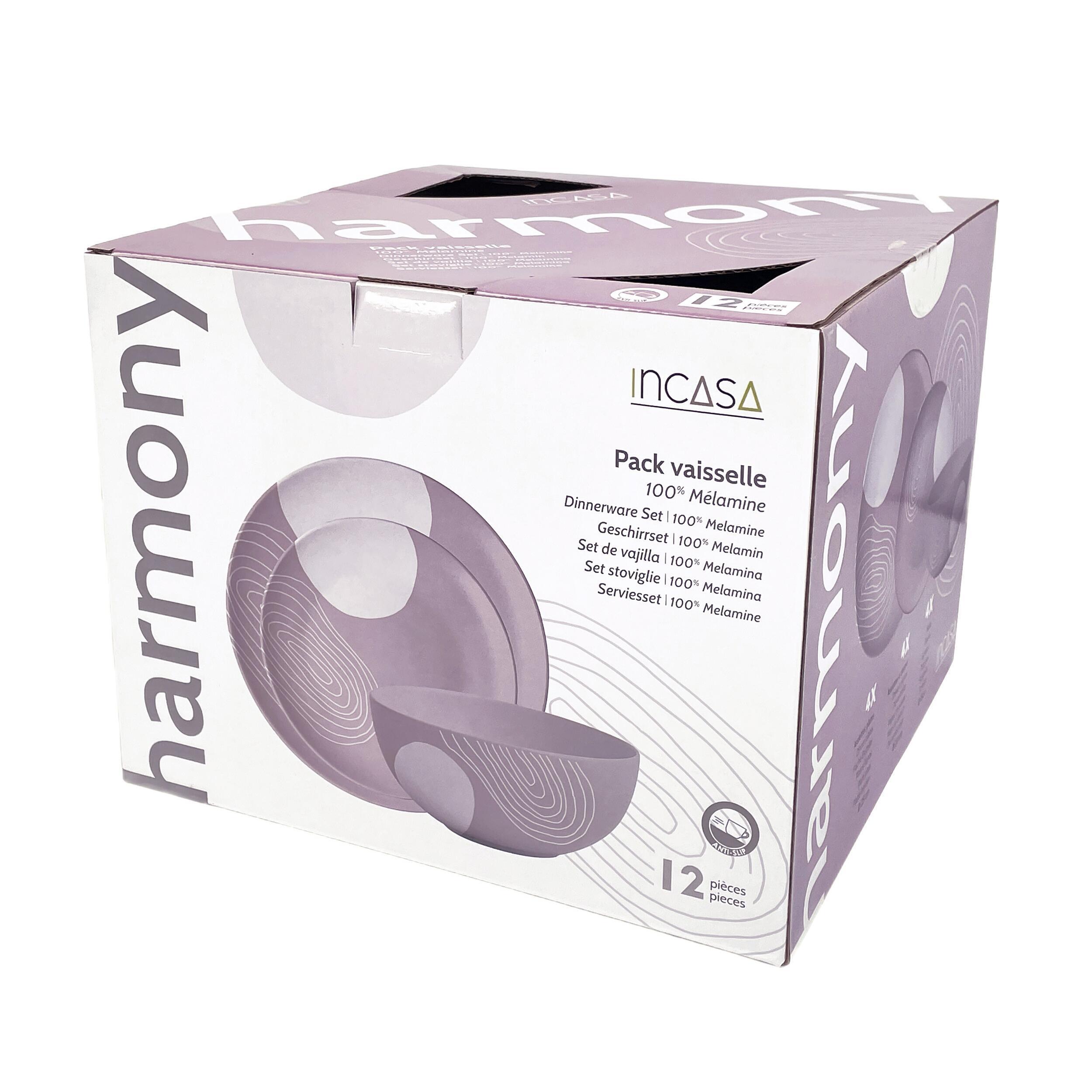 Pack vaisselle mélamine Harmony Incasa sans BPA 12 pièces, design moderne et résistant. Idéal pour 4 personnes en camping-car, van ou caravane. Léger, pratique et compatible lave-vaisselle (panier supérieur).