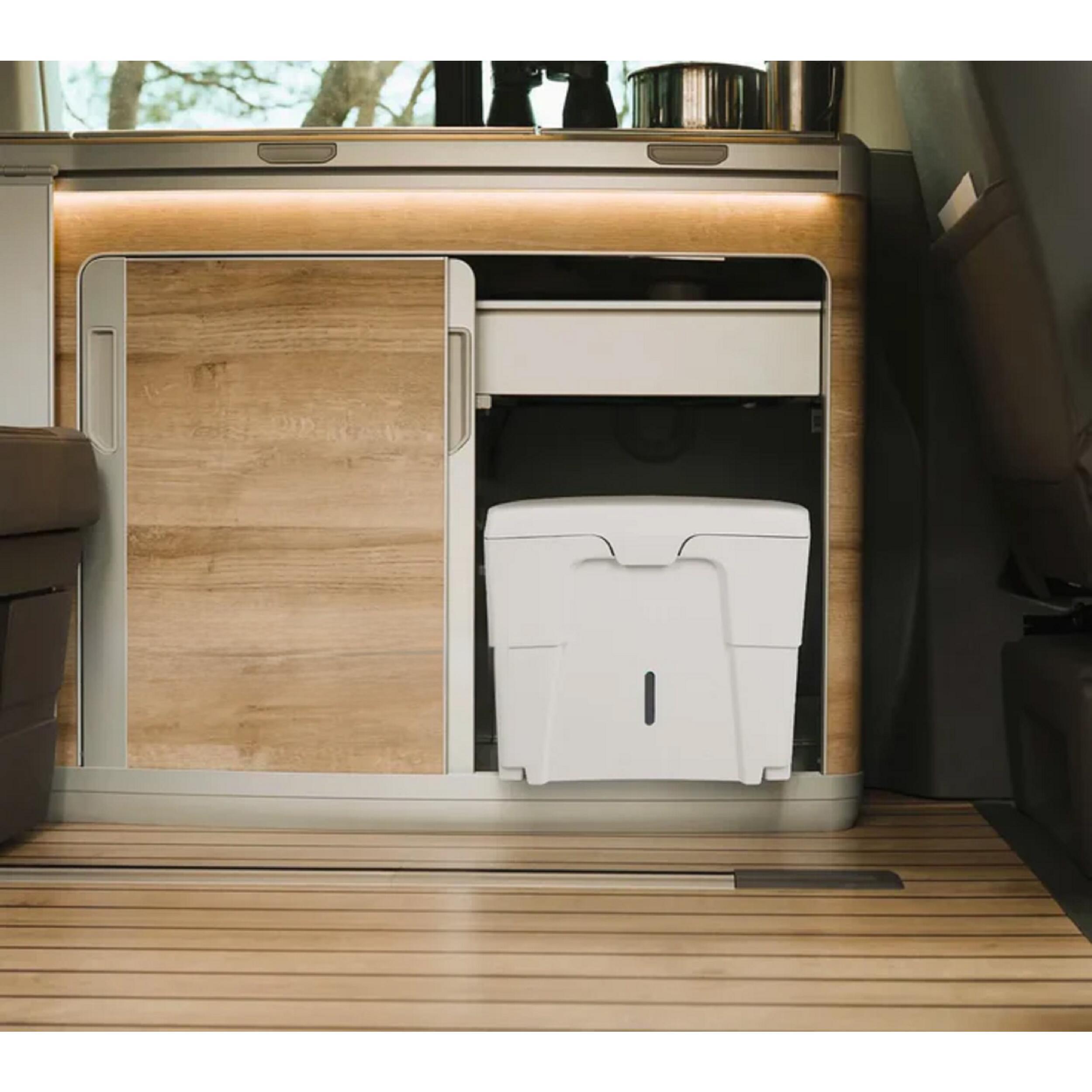 Les deux versions se rangent facilement grâce à leurs dimensions compactes. Le poids varie selon le modèle, de 3,3 à 4,2 kg. Le transport est facilité par la conception robuste et la fermeture étanche du couvercle. Les récipients se retirent séparément pour une vidange rapide. Les matières solides peuvent être jetées avec les déchets ménagers et les liquides éliminés dans des toilettes classiques ou dilués pour d’autres usages. Le nettoyage se fait simplement grâce au polypropylène résistant.